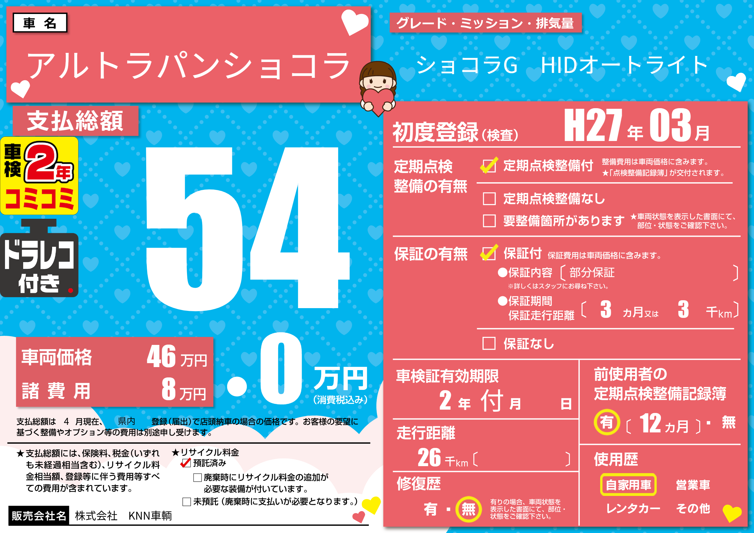 | 走行キロ | 2.6万km | 初年度登録 | H27年03月 |