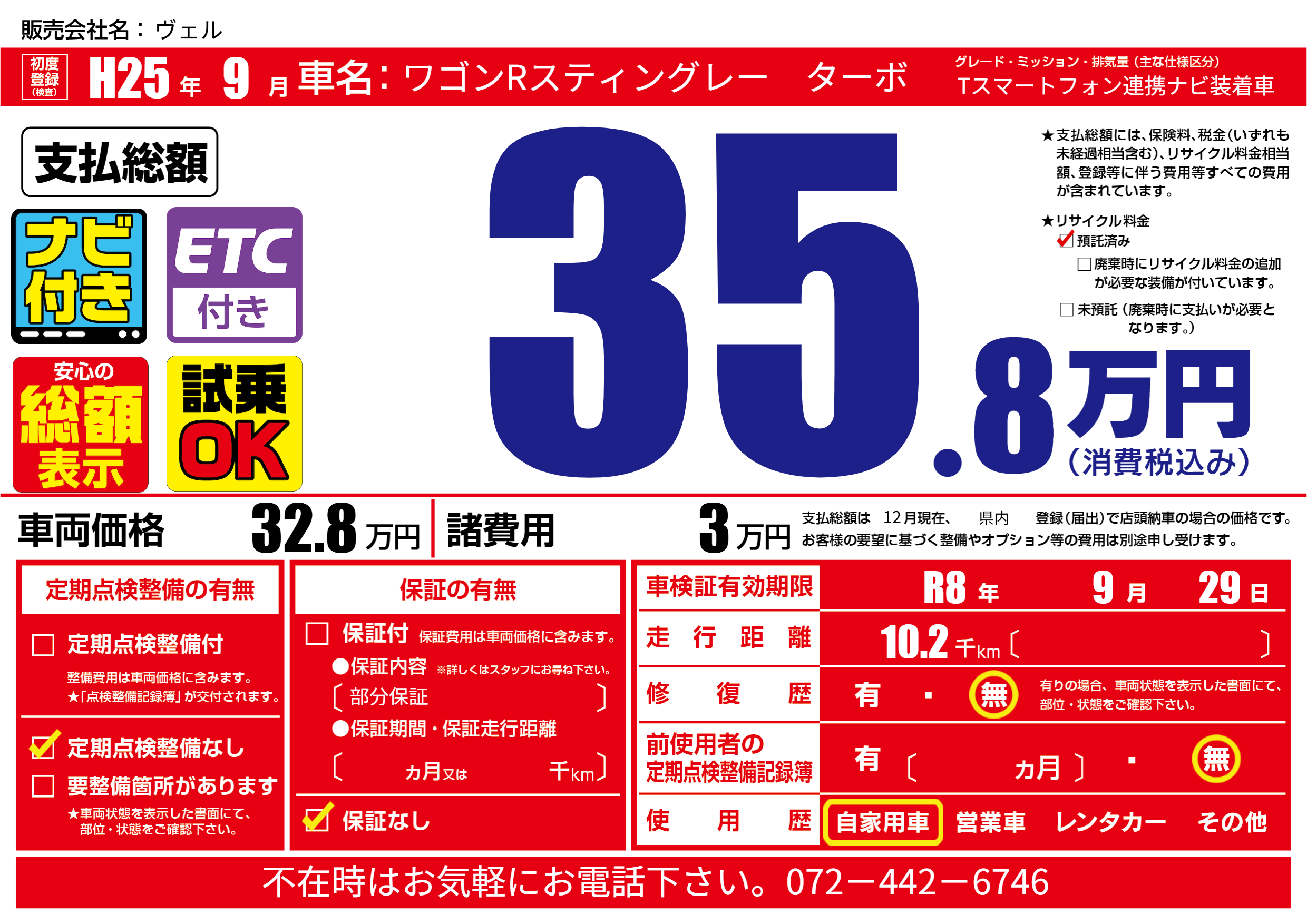 | 走行キロ | 1万km | 初年度登録 | H25年9月 |