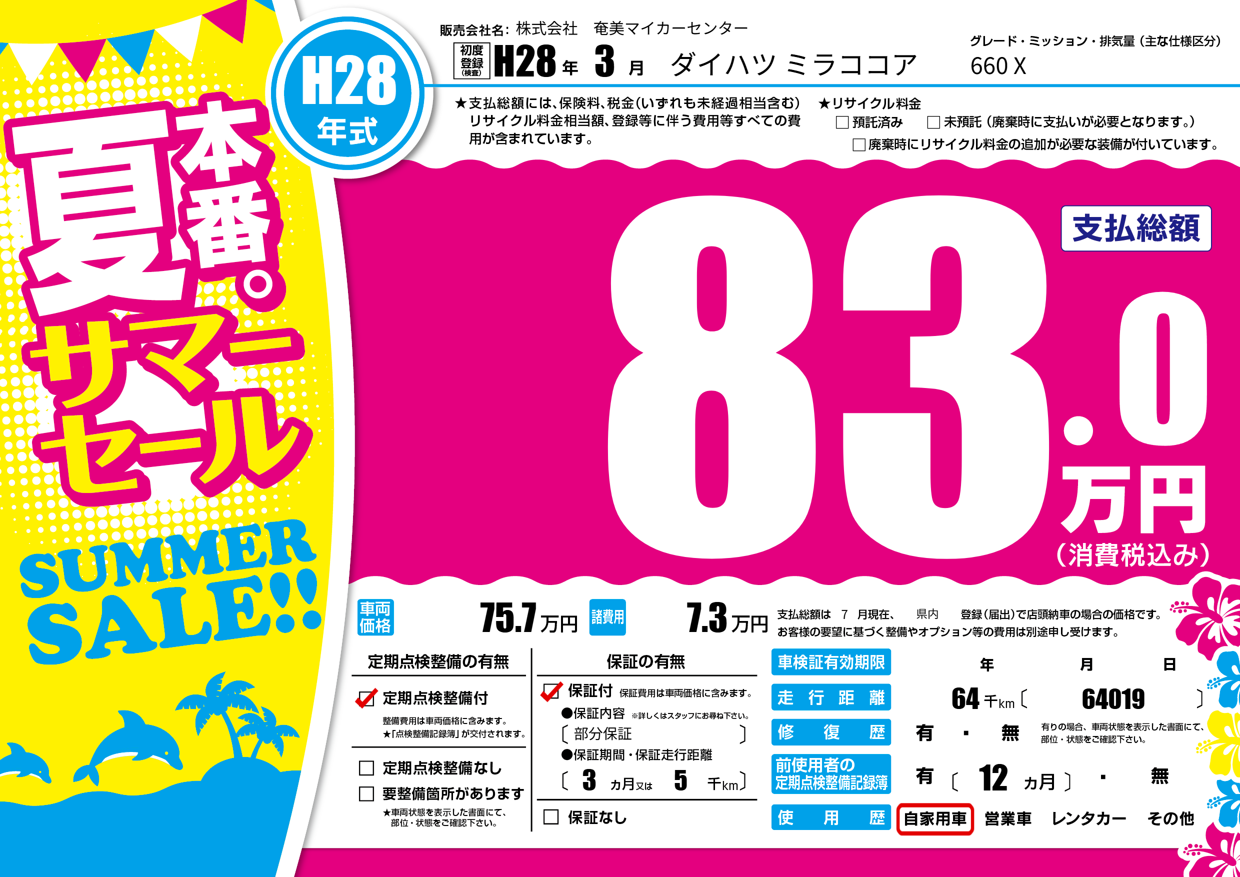 | 走行キロ | 6.4万km | 初年度登録 | H28年3月 |
