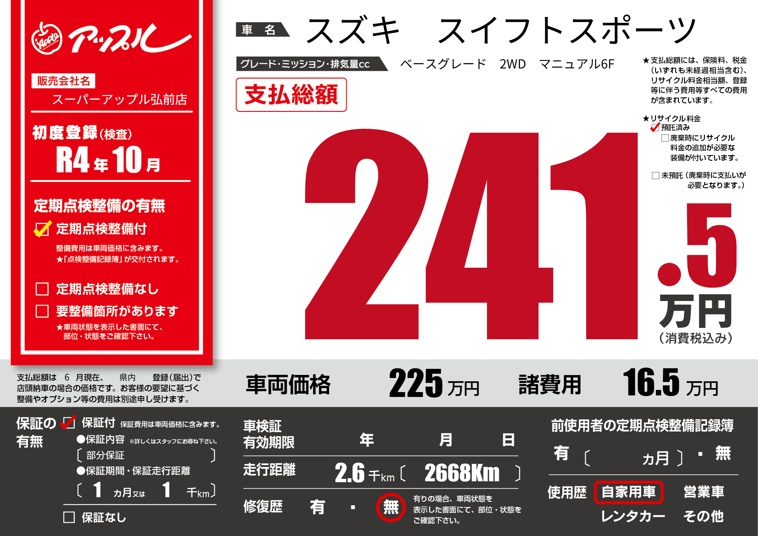 | 車名 | スズキ スイフトスポーツ | グレード ミッション 排気量 |