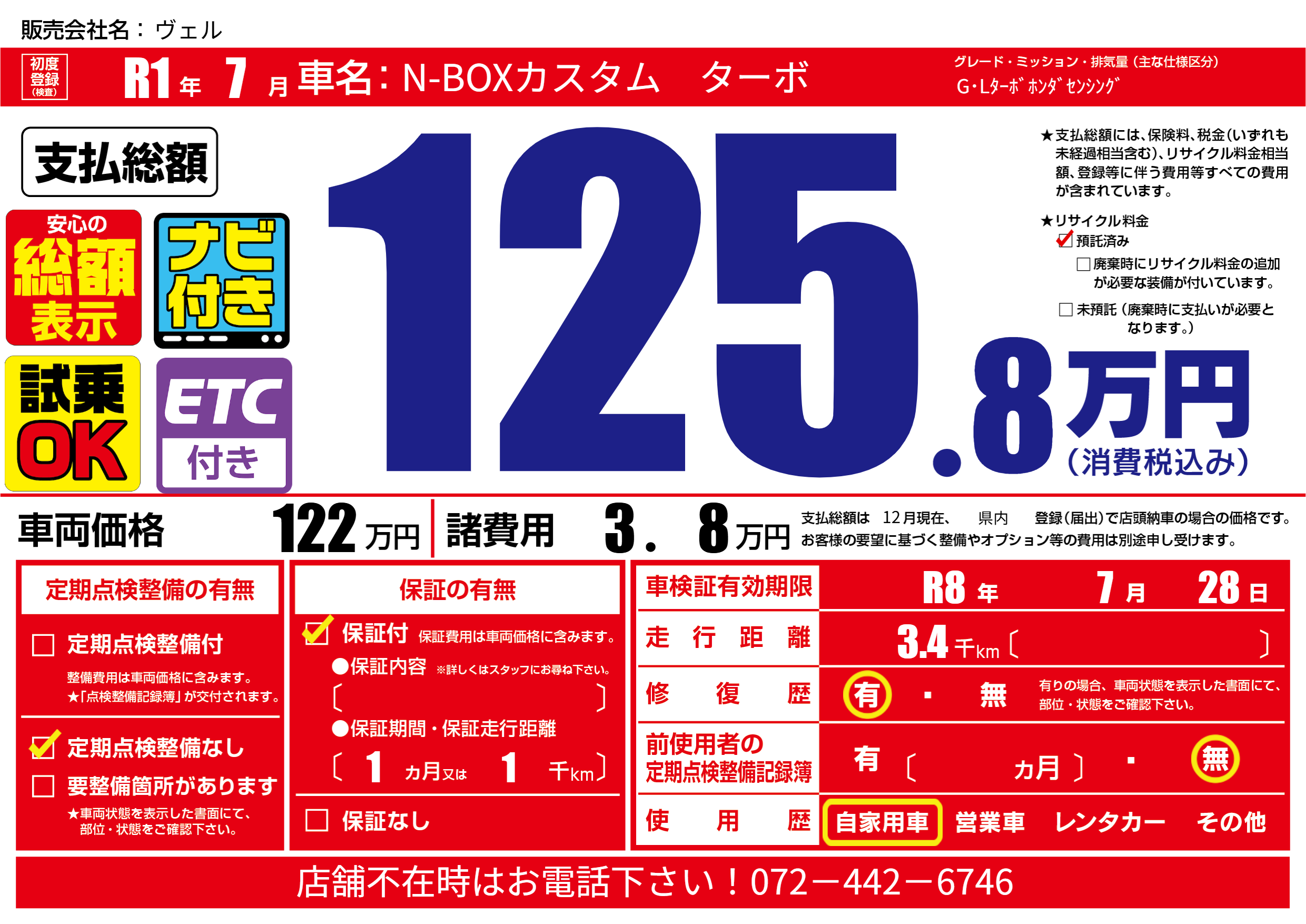 なし | 車検制限 | R8年7月28月 |