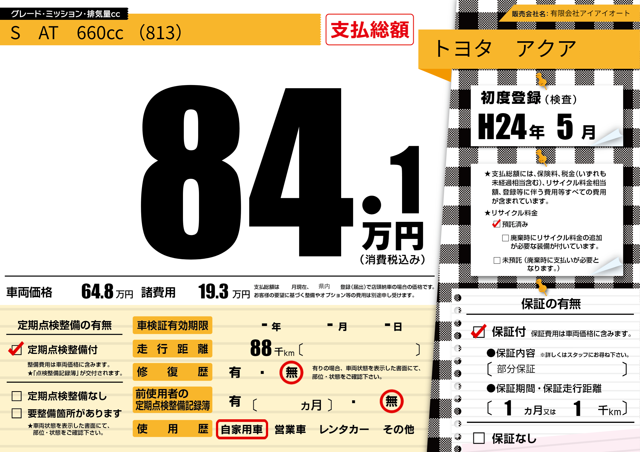 | 車名 | トヨタ アクア | グレード ミッション 排気量 |