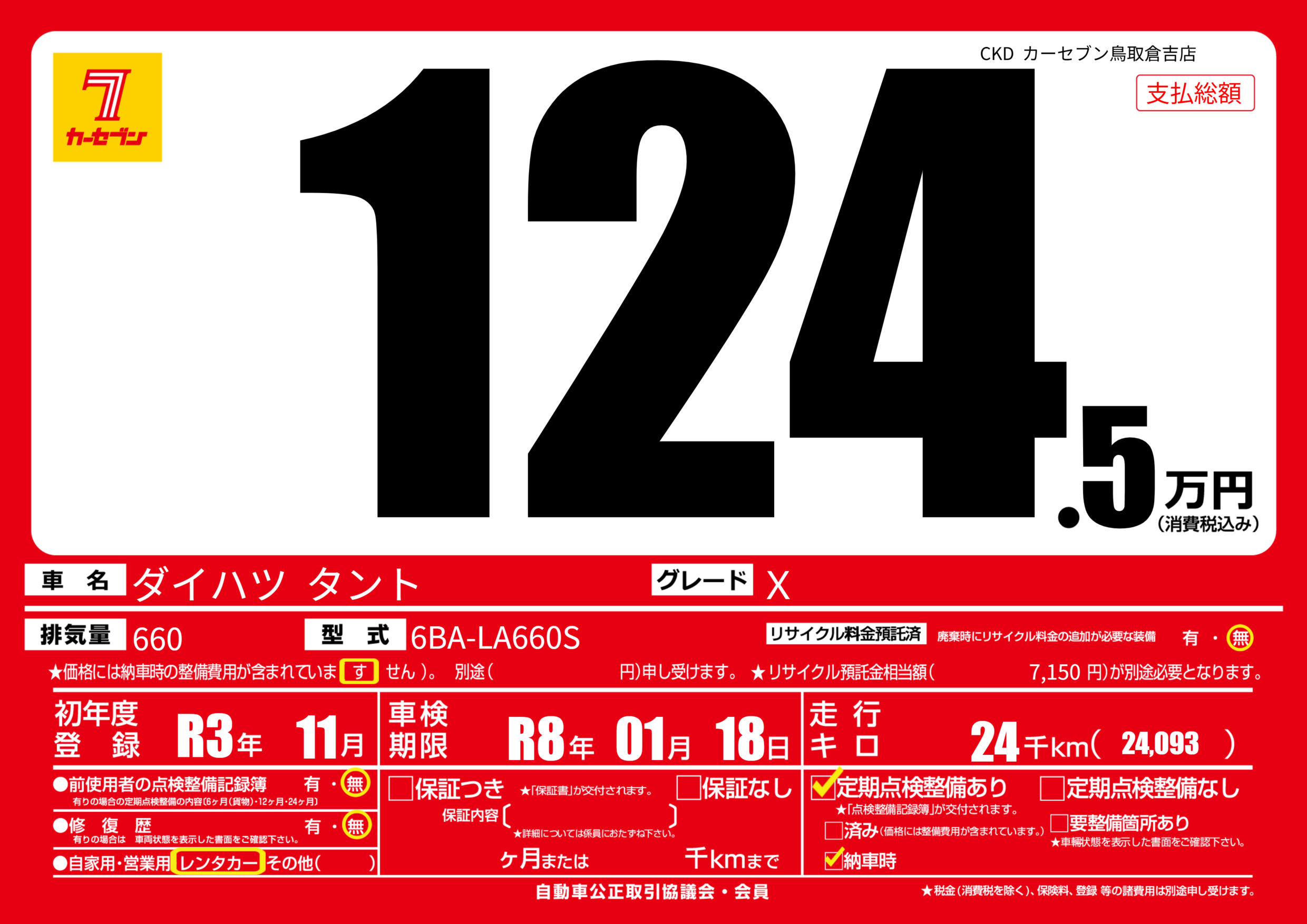 | 車名 | ダイハツ タント | グレード ミッション 排気量 |