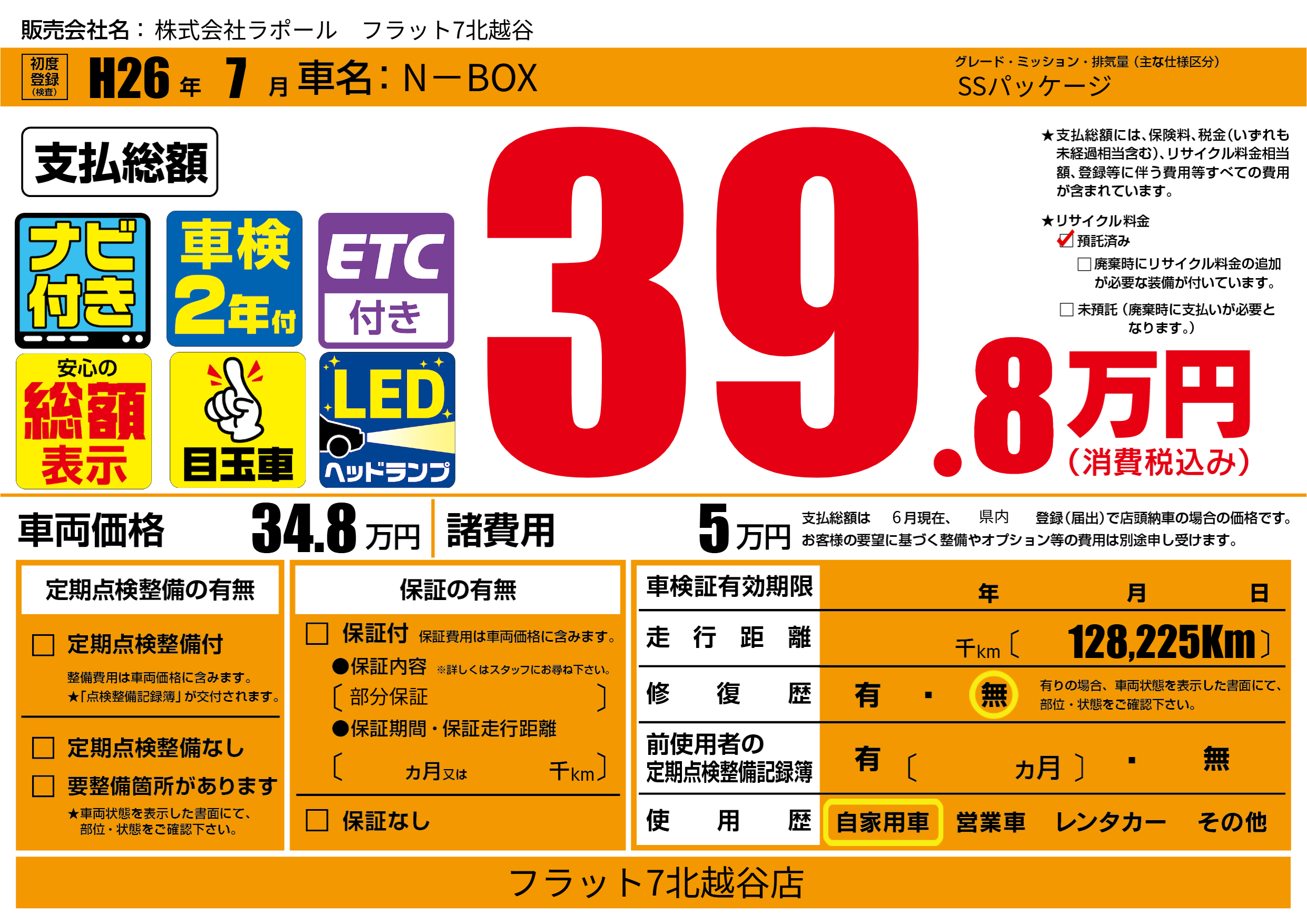 | 走行キロ | - | 初年度登録 | H26年7月 |