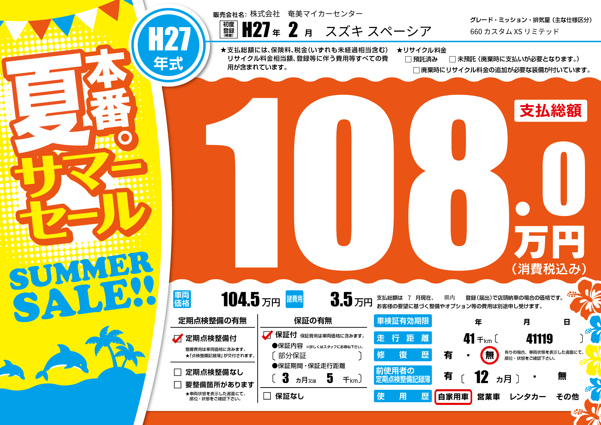 | 走行キロ | 4.1万km | 初年度登録 | H27年2月 |