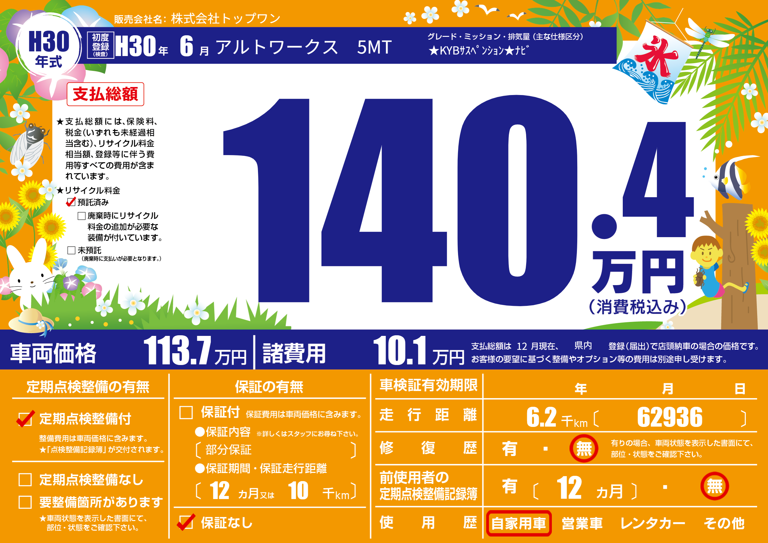 | 車名 | アルトワークス 5MT | グレード ミッション 排気量 |