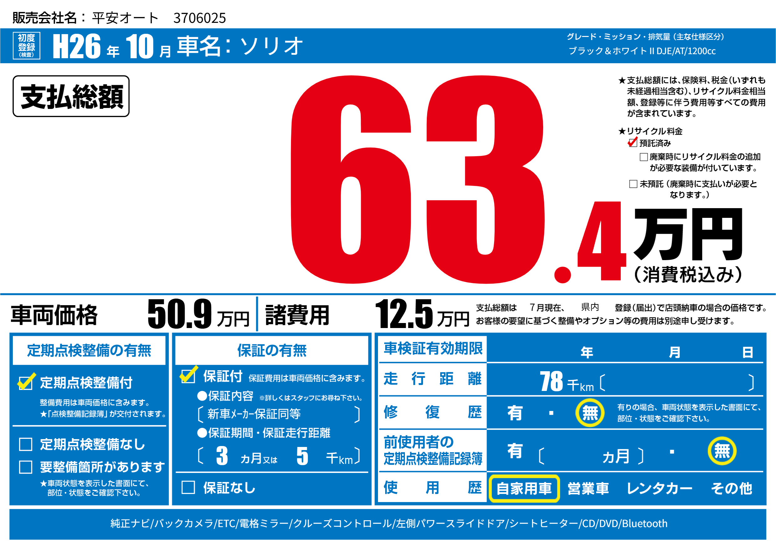 | 走行キロ | 7.8万km | 初年度登録 | H26年10月 |