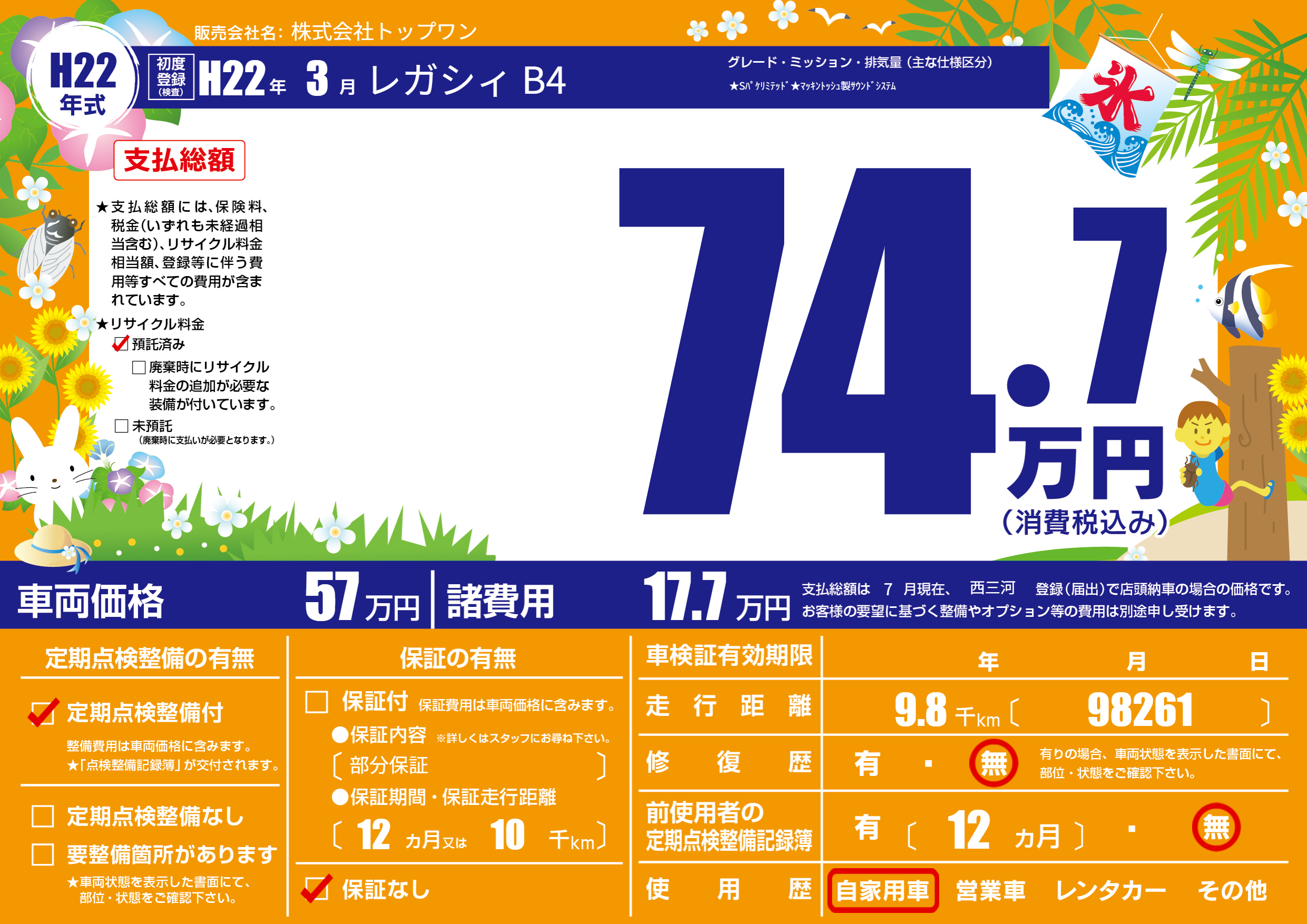 | 車名 | レガシィ B4 | グレード ミッション 排気量 |
