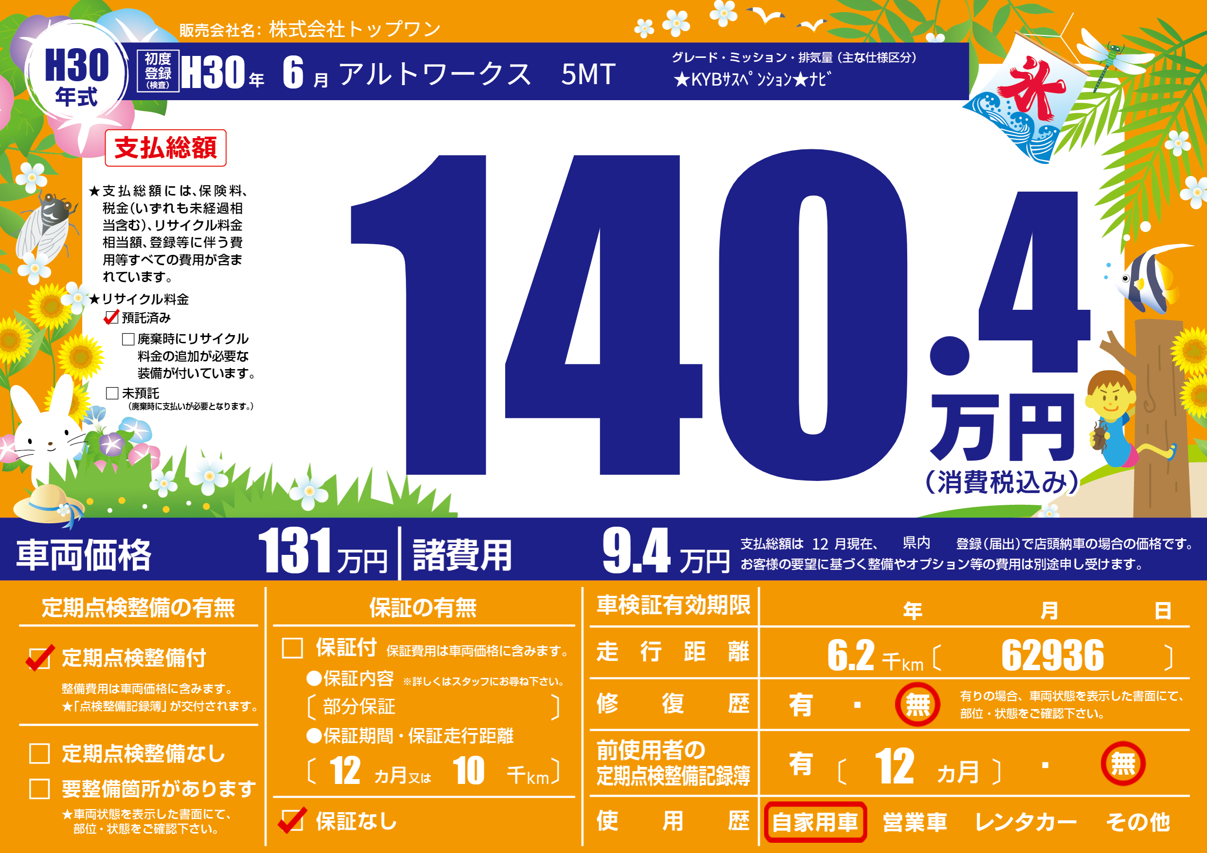 | 車名 | アルトワークス 5MT | グレード ミッション 排気量 |
