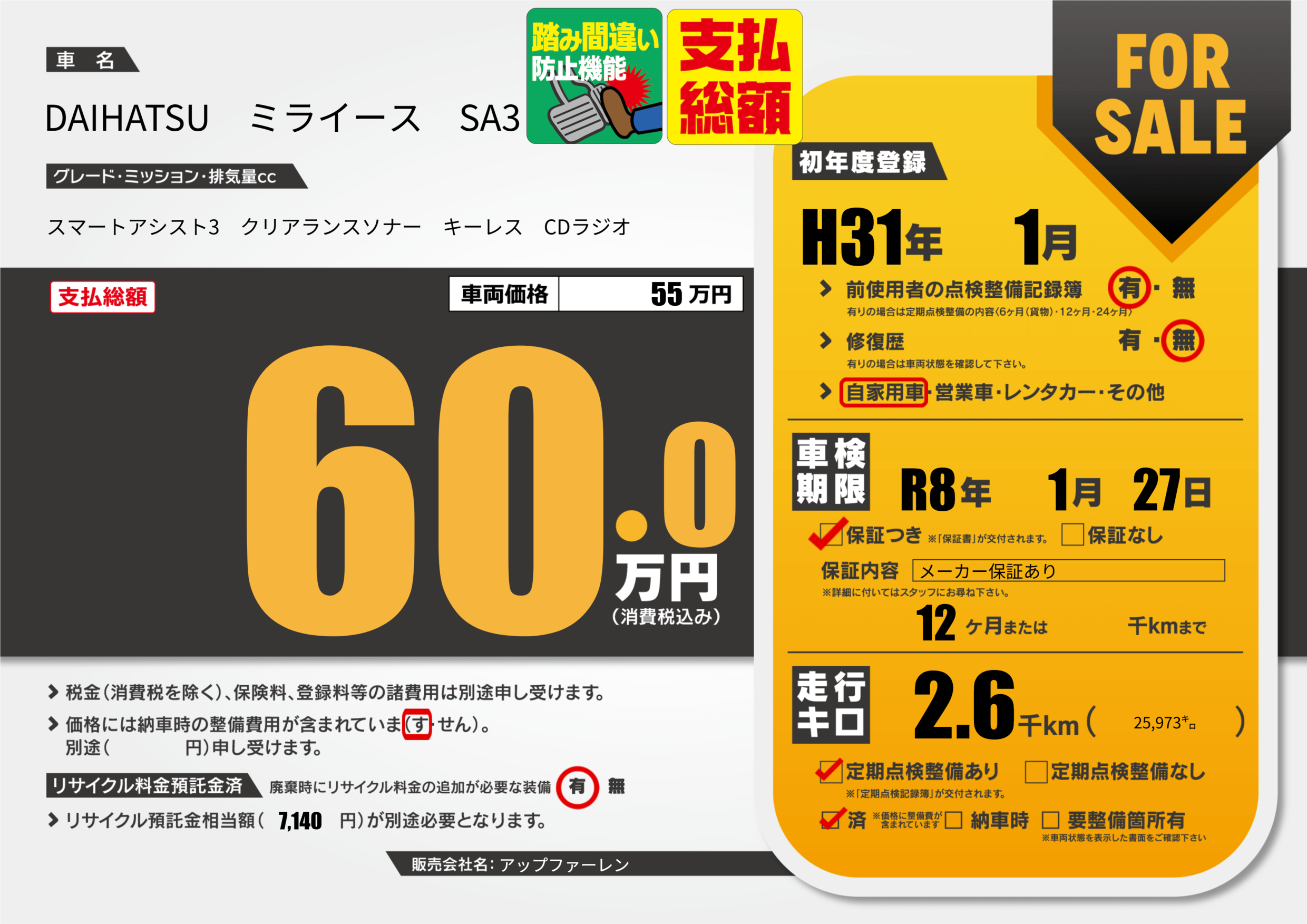 | 定期点検整備 | 定期点検整備あり 定期点検整備済み | ||