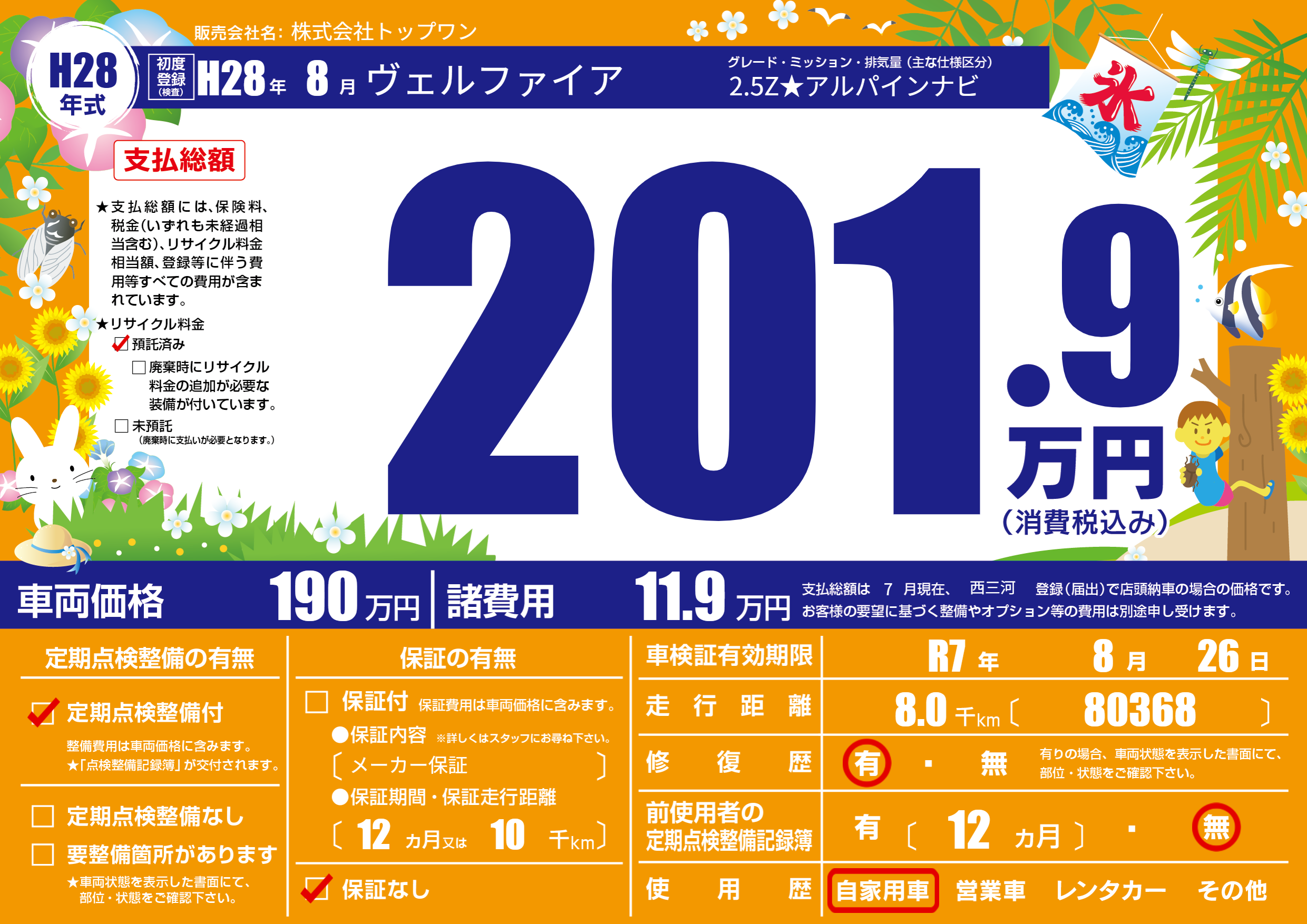 | 走行キロ | 0.8万km | 初年度登録 | H28年8月 |