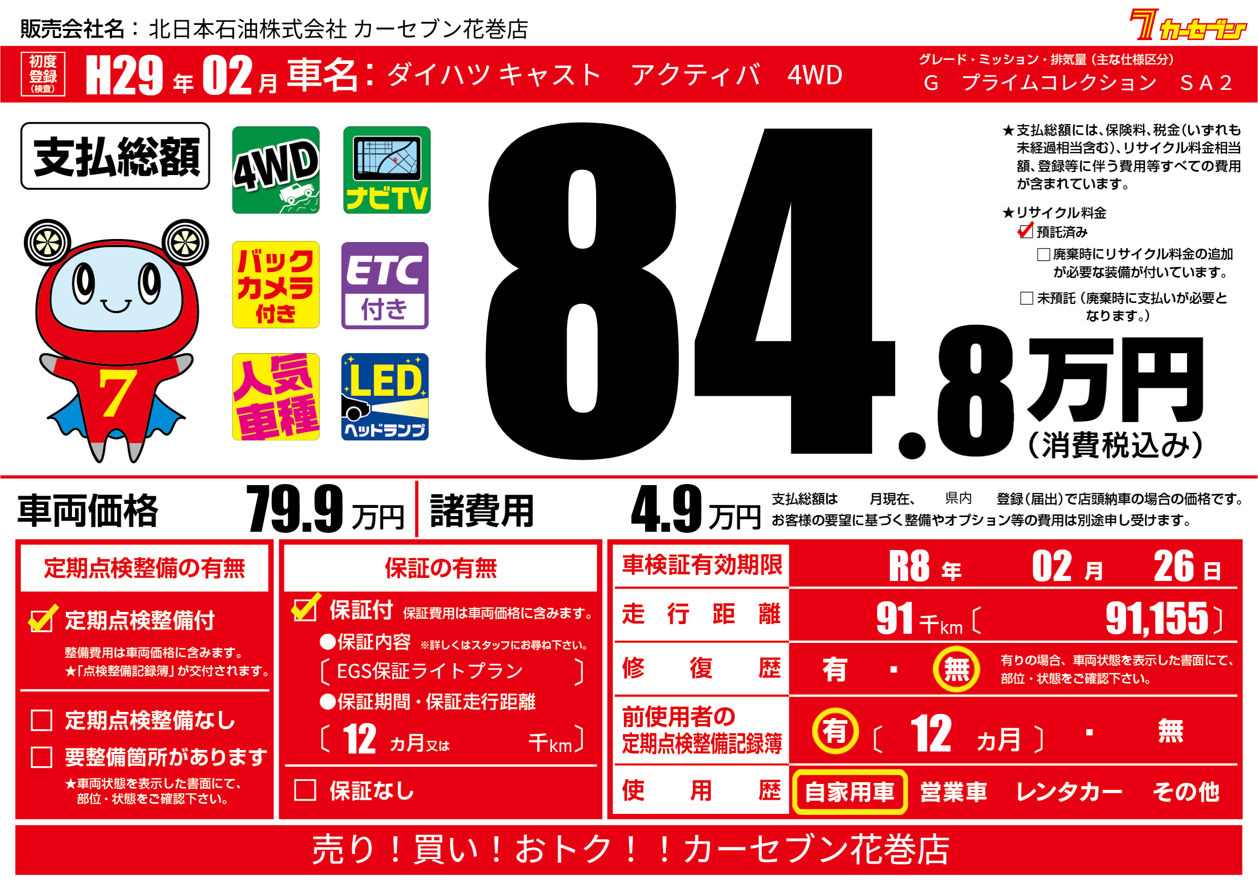 | 走行キロ | 9.1万km | 初年度登録 | H29年02月 |