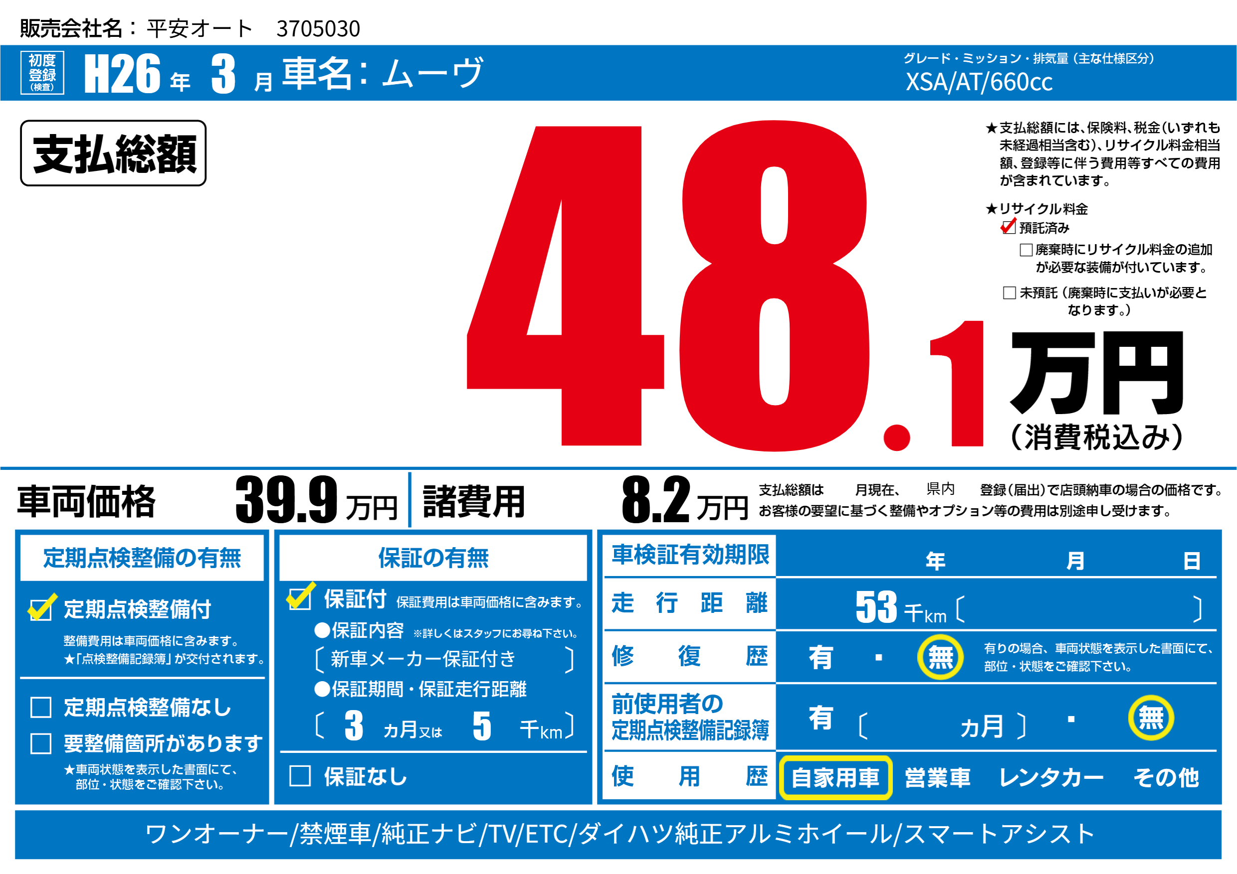 | 走行キロ | 5.3万km | 初年度登録 | H26年3月 |