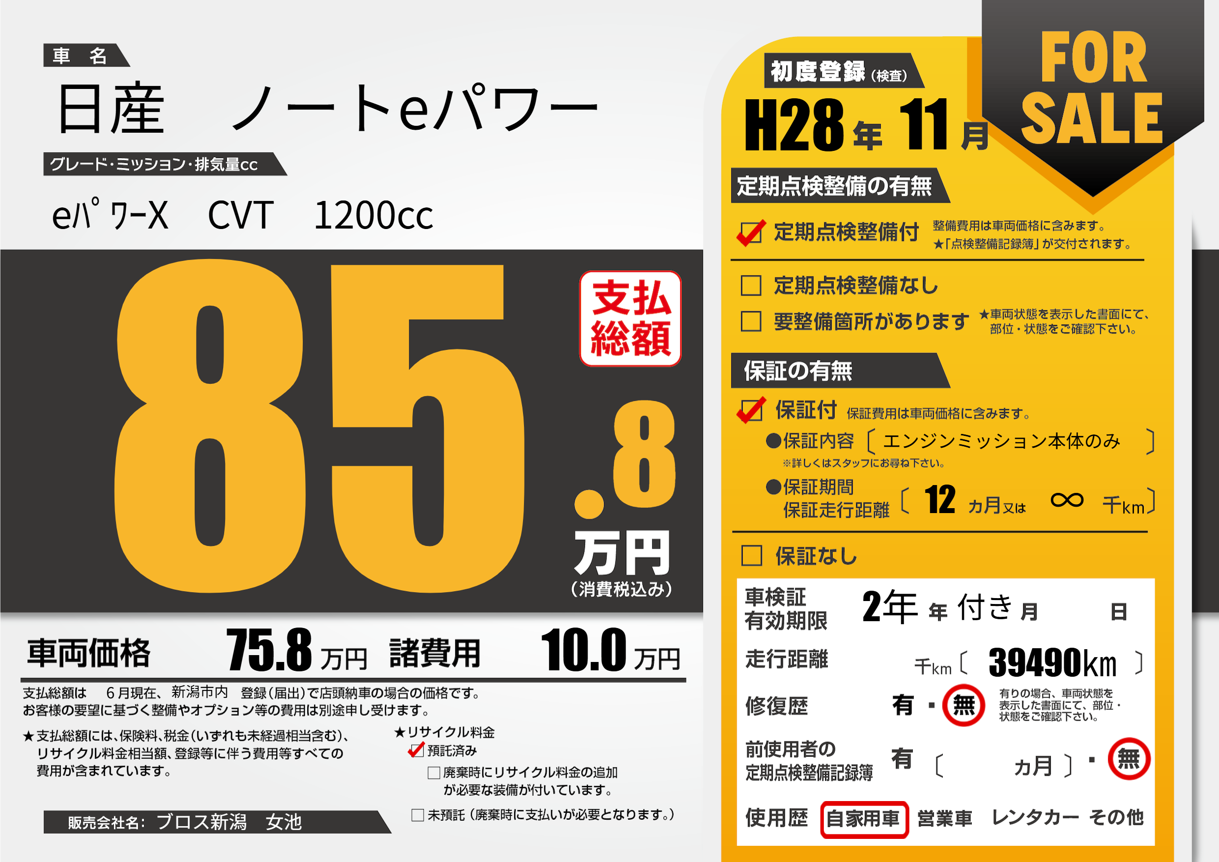 | 車名 | 日産 ノートeパワー | グレード ミッション 排気量 |