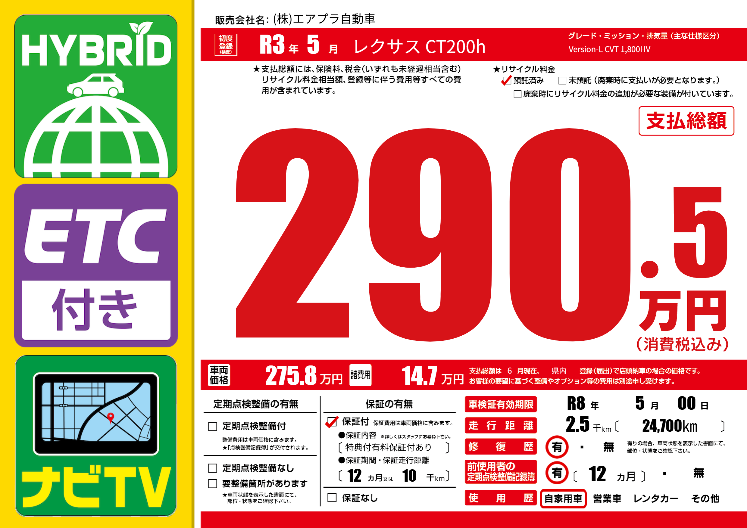 | 車名 | レクサス CT200h | グレード ミッション 排気量 |