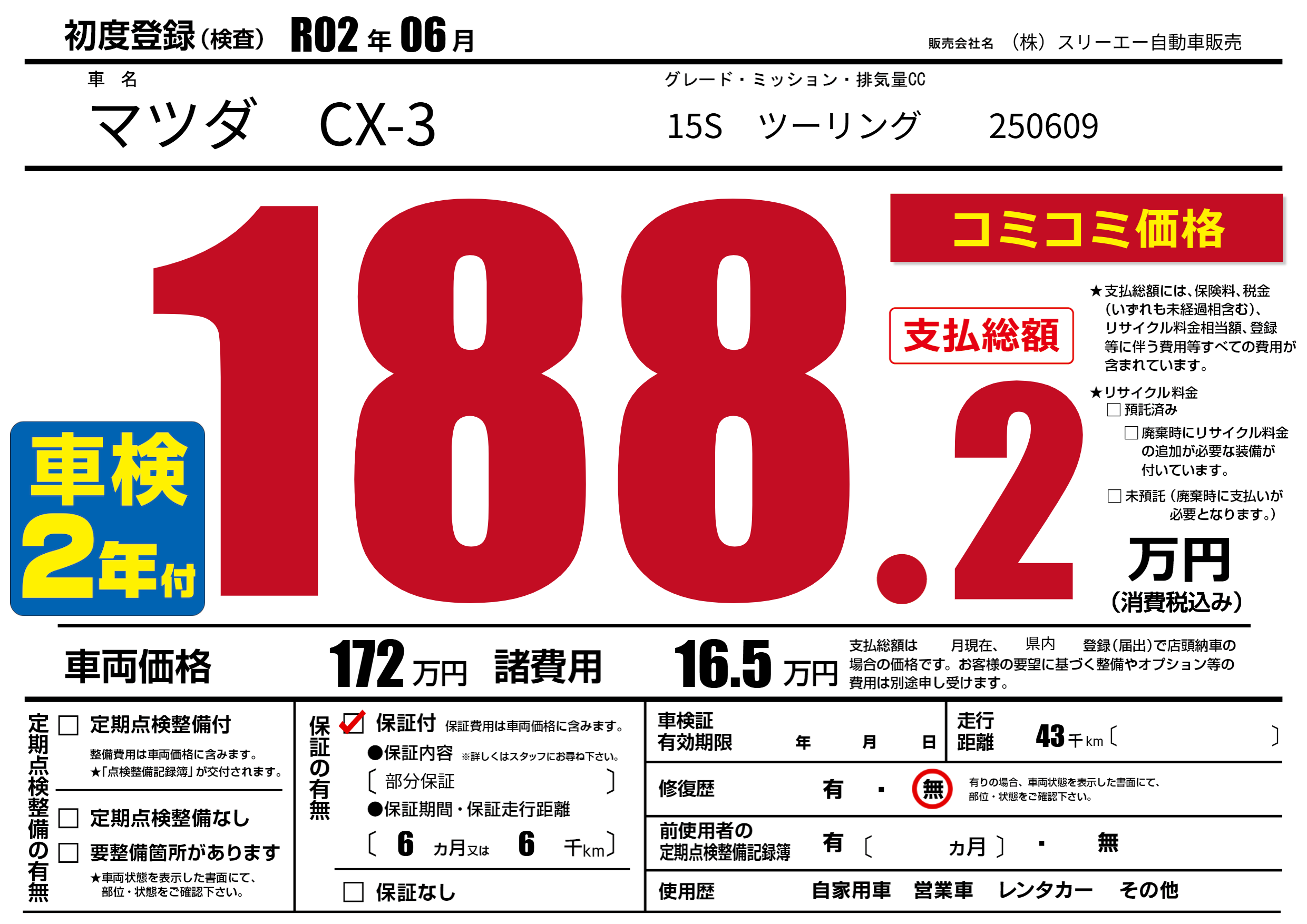 | 車名 | マツダ CX-3 | グレード ミッション 排気量 |