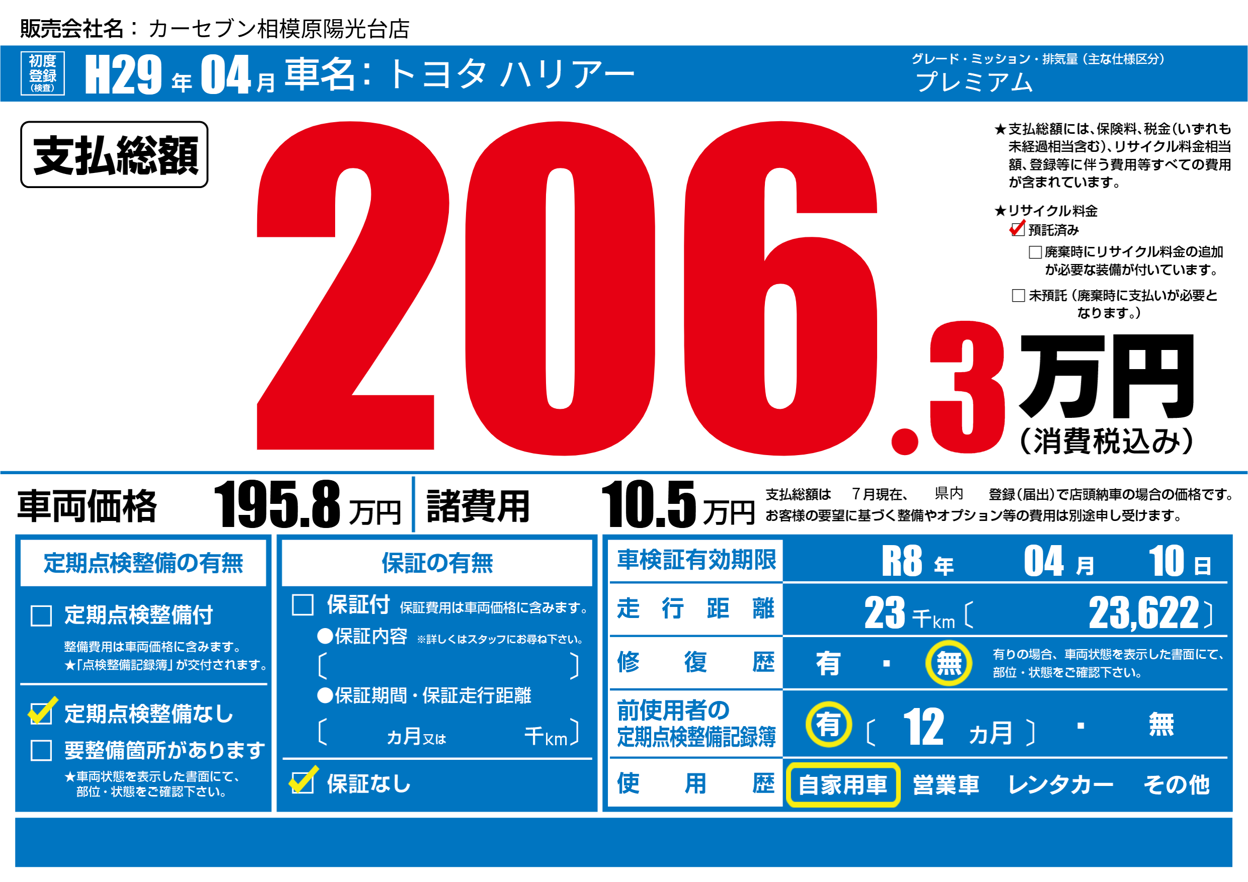 | 車名 | トヨタ ハリアー | グレード ミッション 排気量 |