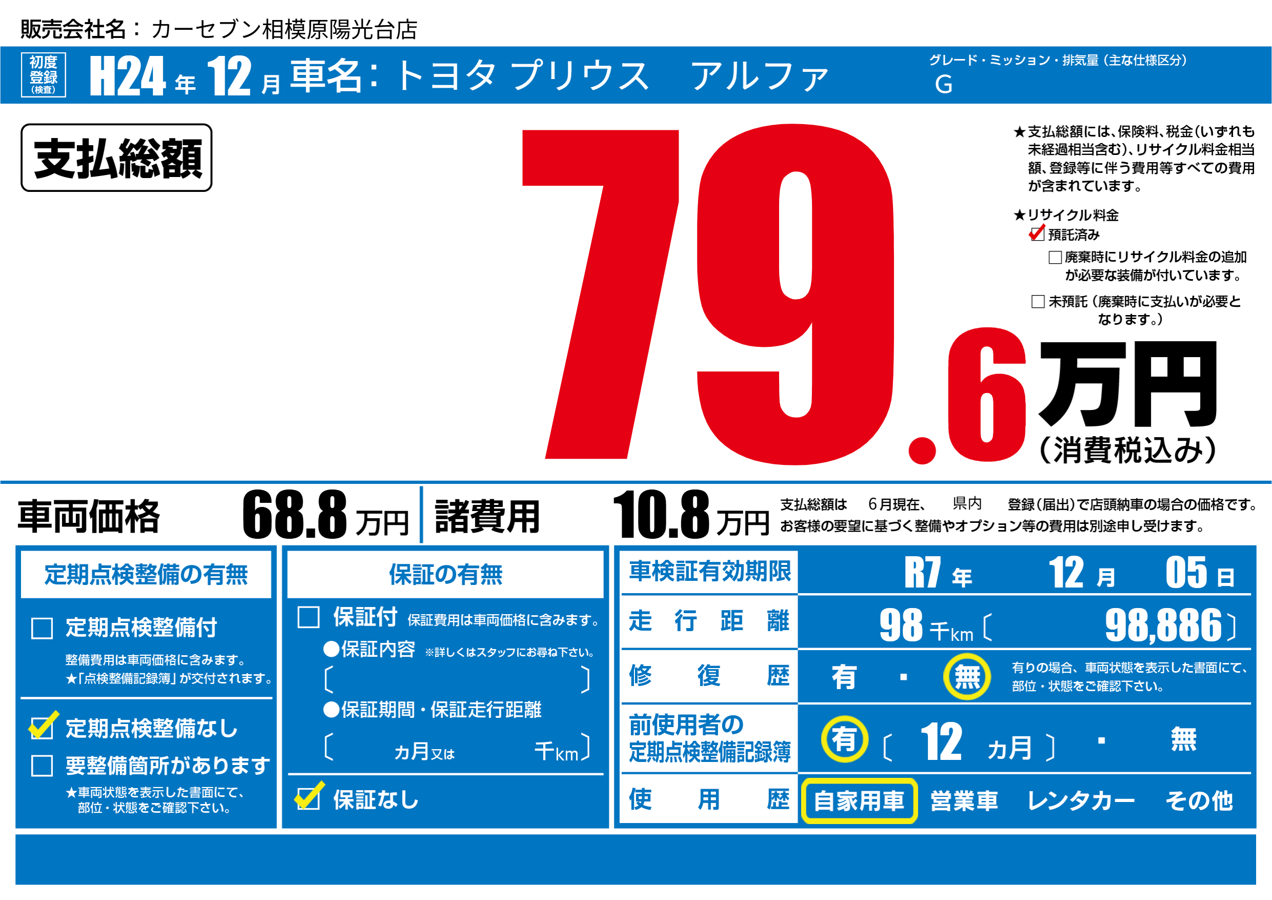 | 走行キロ | 9.8万km | 初年度登録 | H24年12月 |