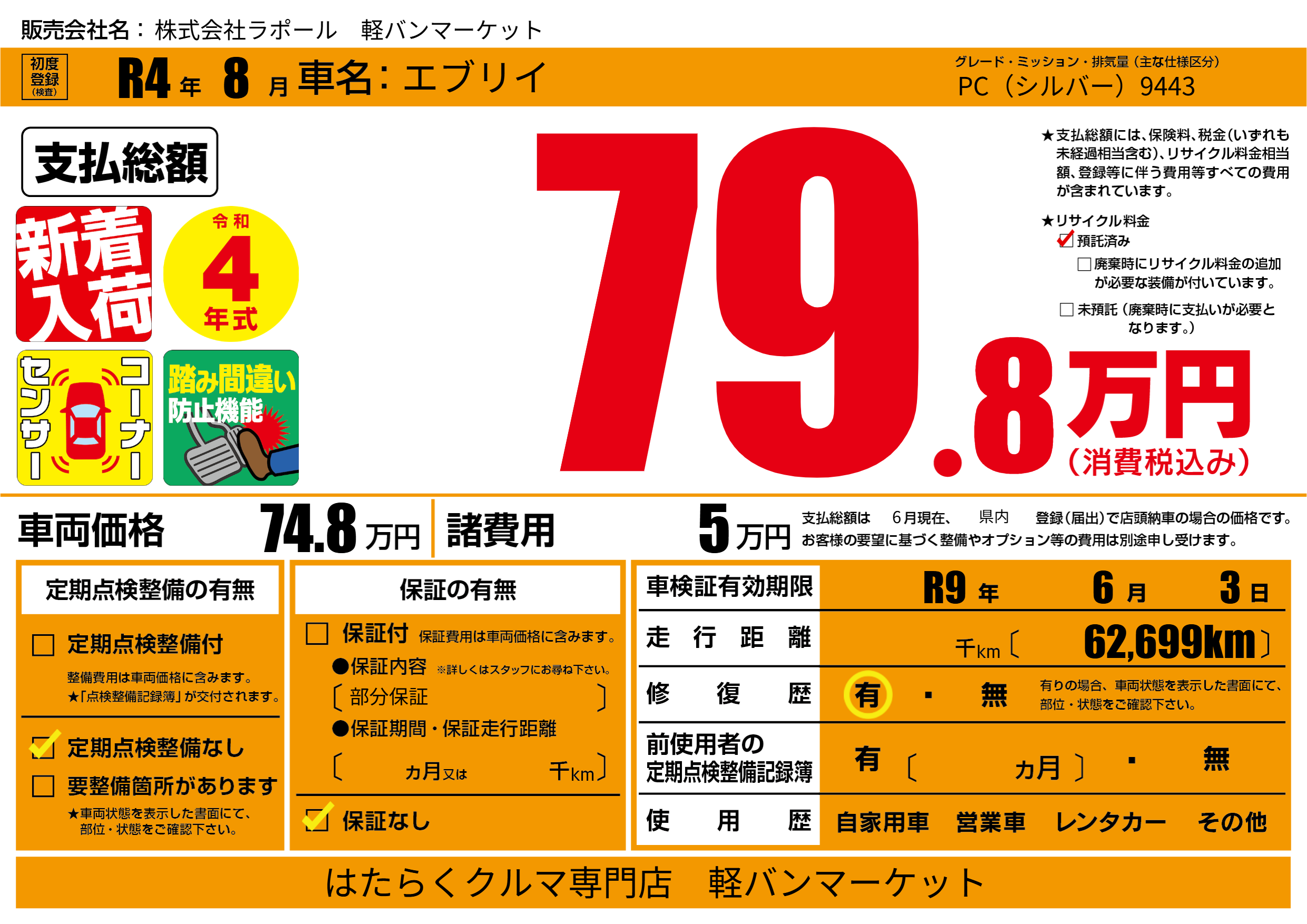 なし | 車検制限 | R9年6月3月 |