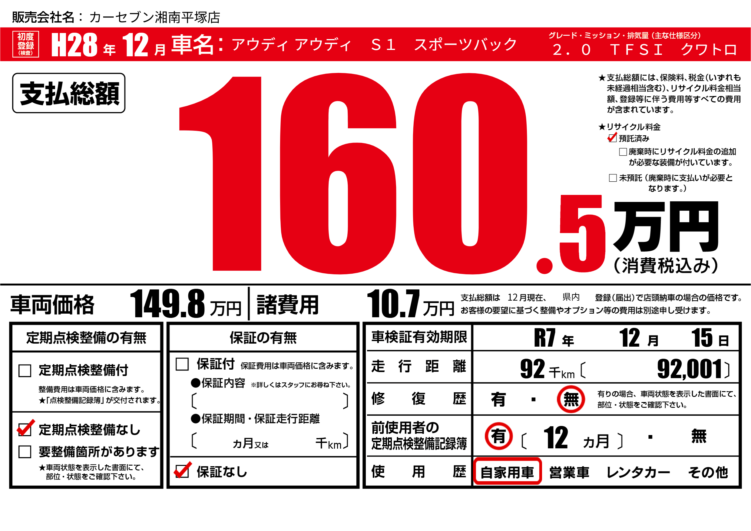 | 定期点検整備 | 定期点検整備なし | ||
