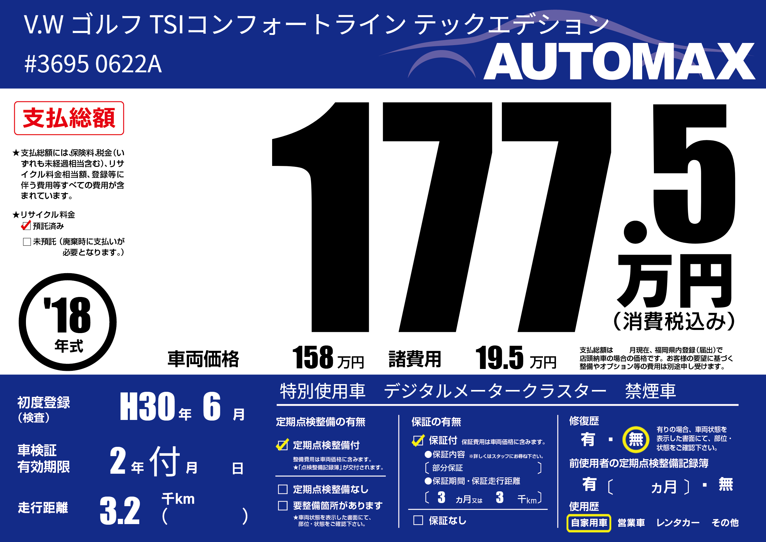 | 走行キロ | 0.3万km | 初年度登録 | H30年6月 |