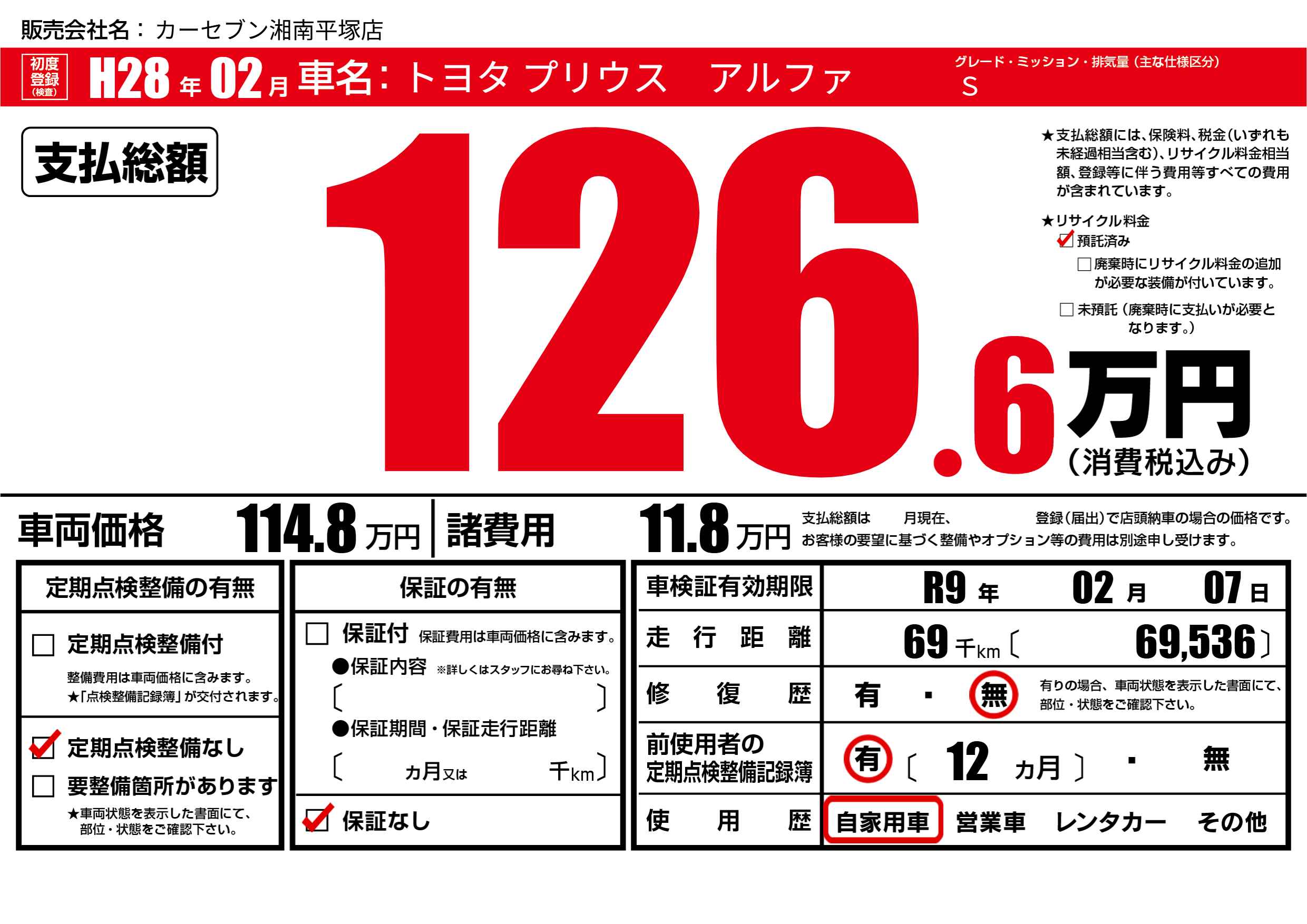 | 走行キロ | 6.9万km | 初年度登録 | H28年02月 |