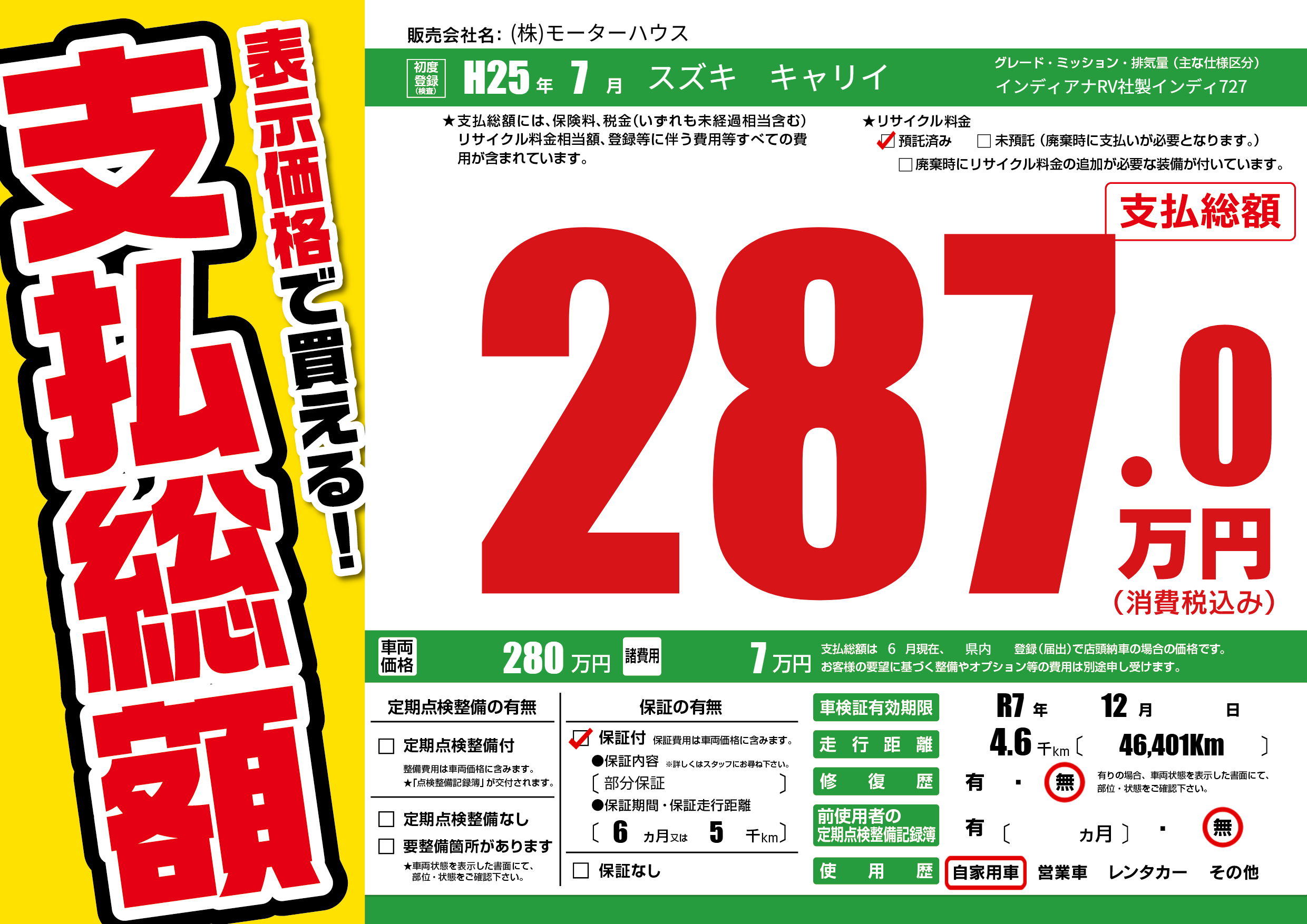 | 走行キロ | 0.4万km | 初年度登録 | H25年7月 |