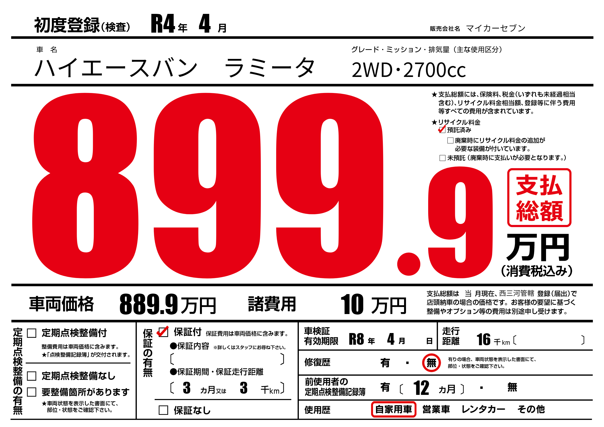 | 車名 | ハイエースバン ラミータ | グレード ミッション 排気量 |