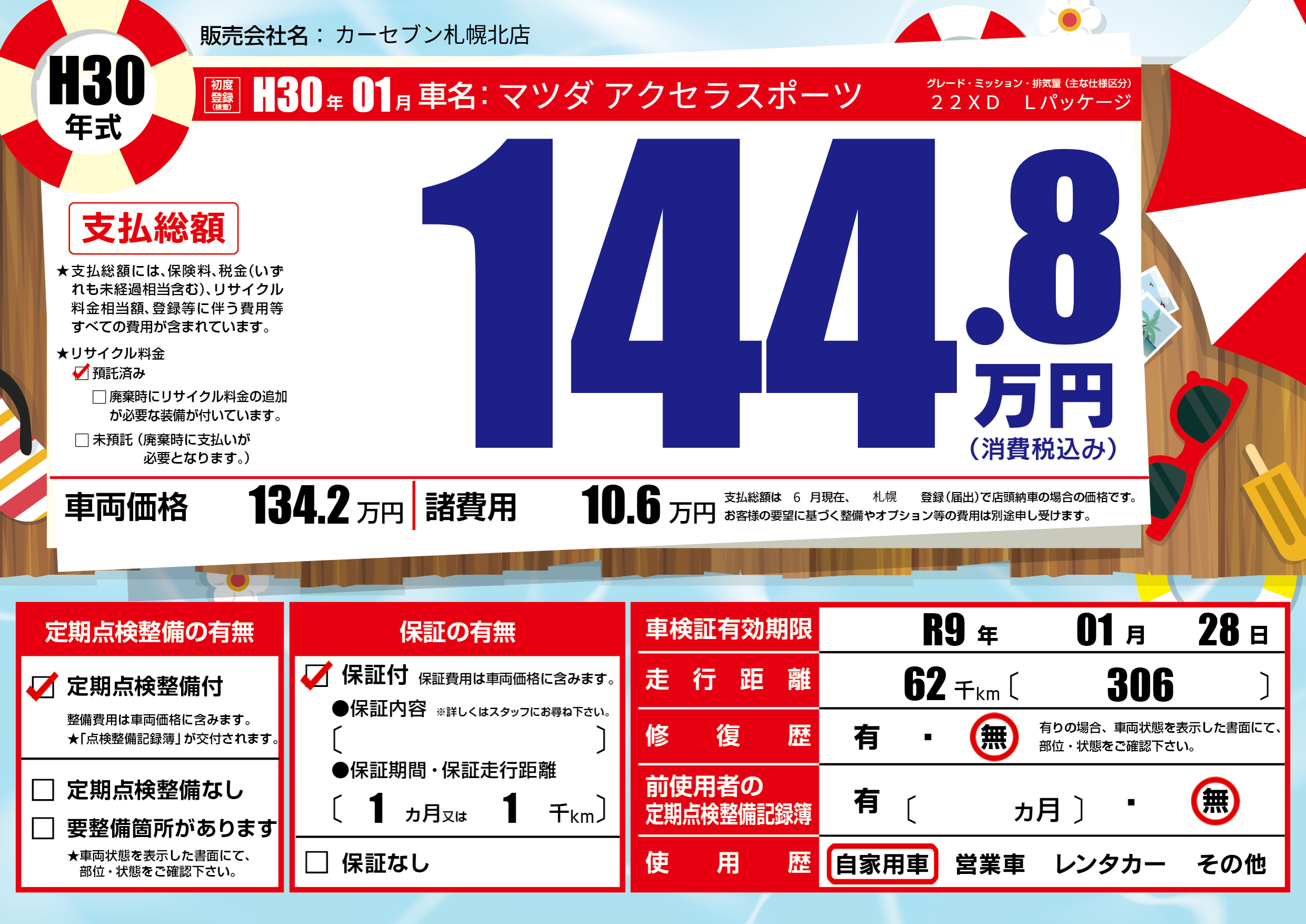 | 車名 | マツダ アクセラスポーツ | グレード ミッション 排気量 |