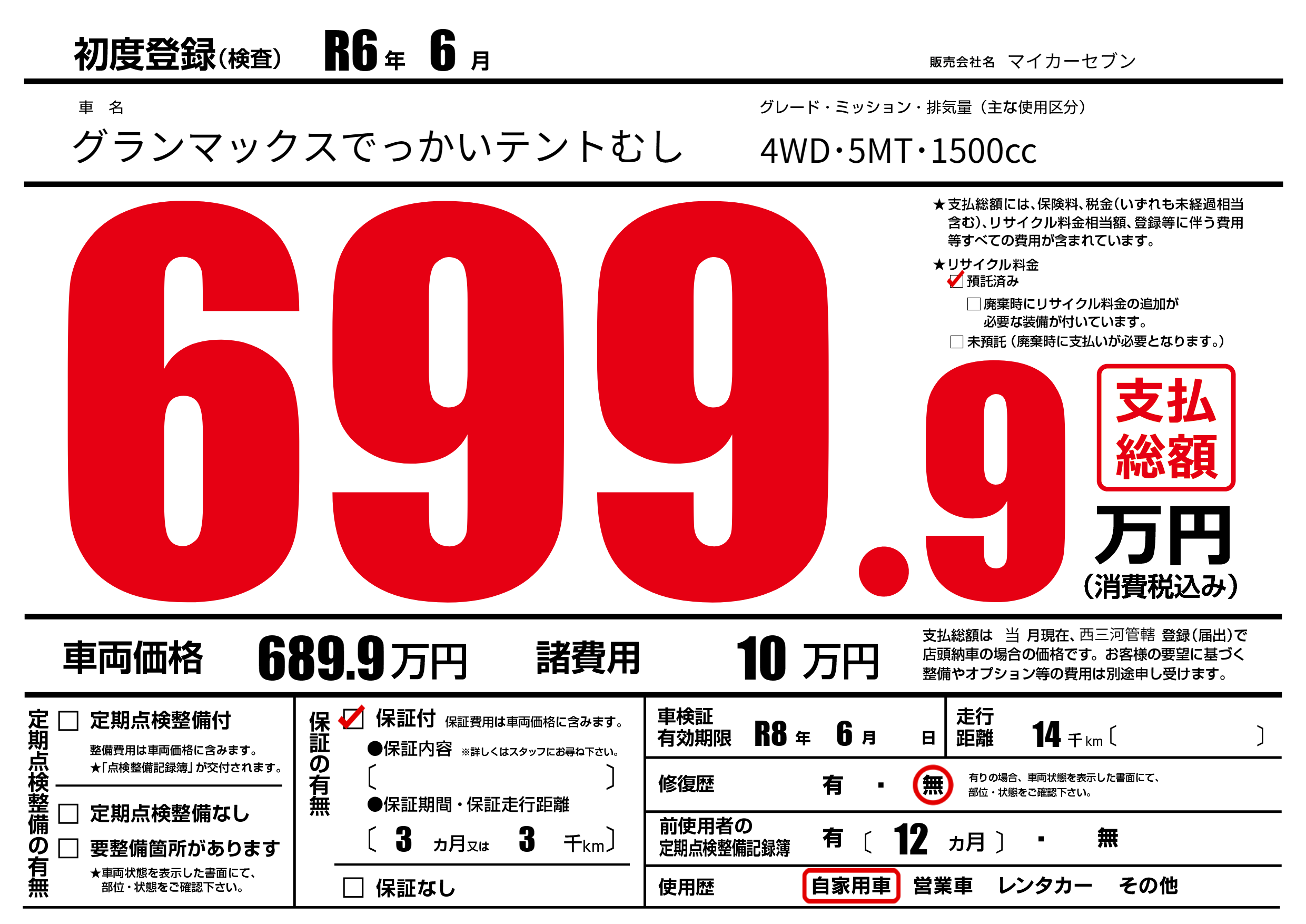 なし | 車検制限 | R8年6月---月 |