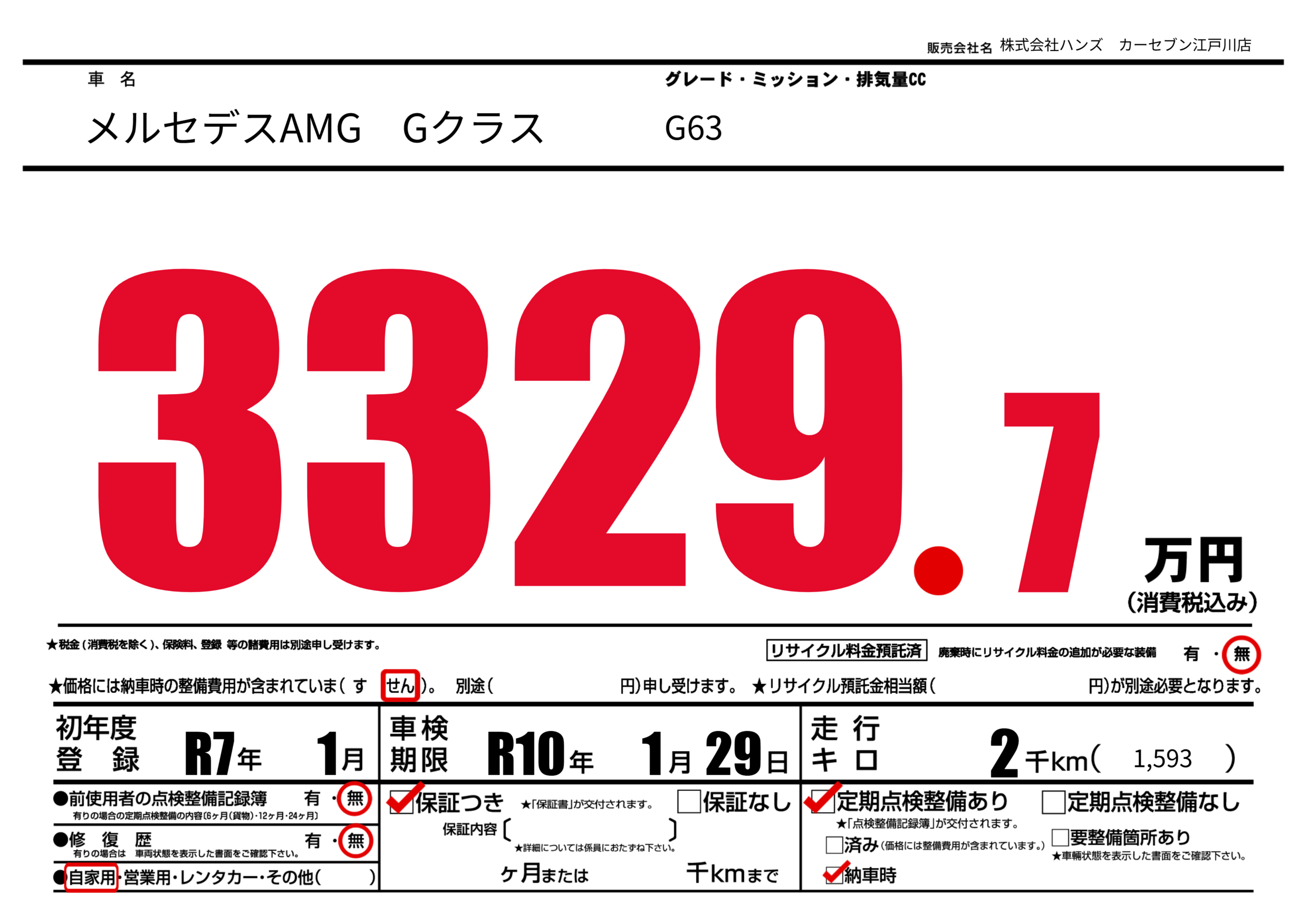 なし | 車検制限 | R10年1月29月 |