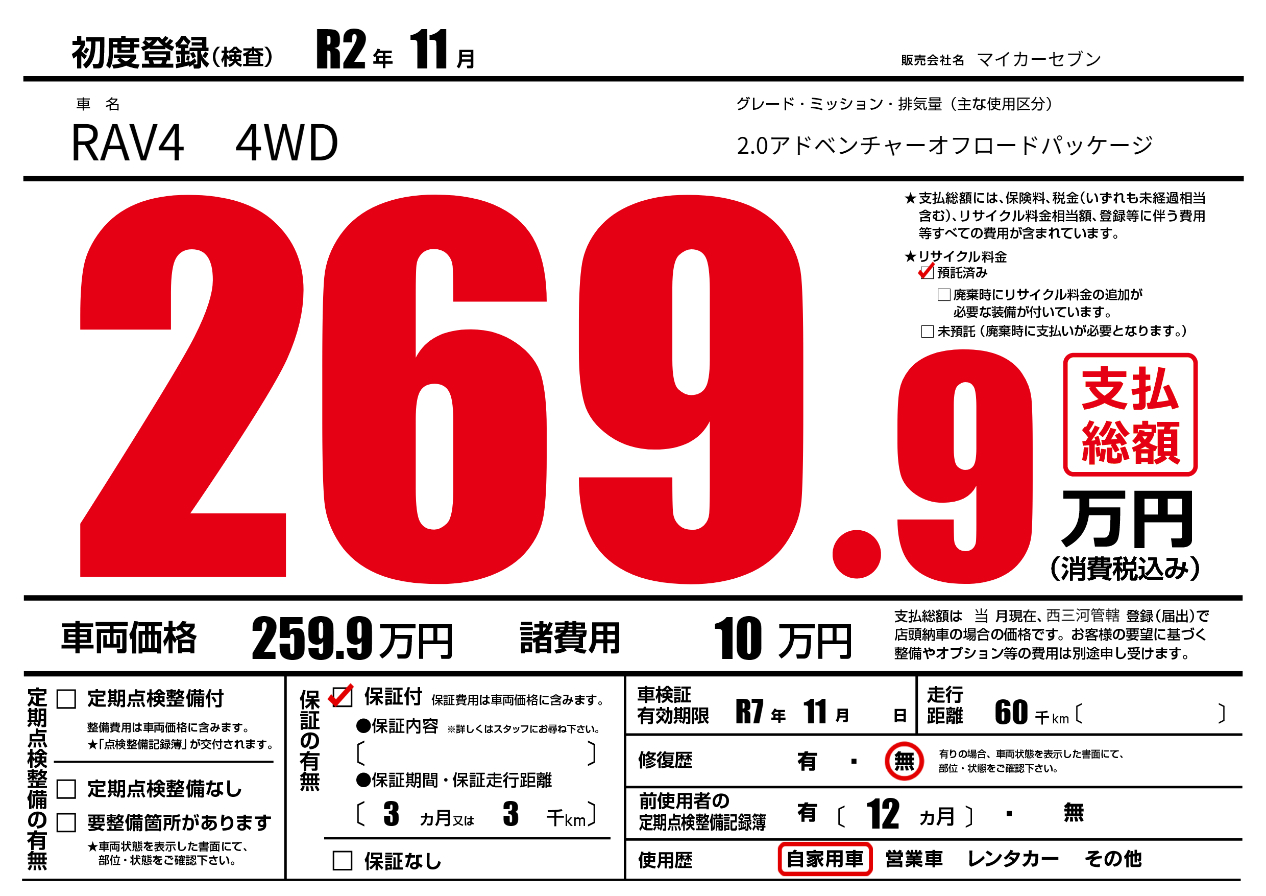 | 車検制限 | R7年 11月 - 日 | ||