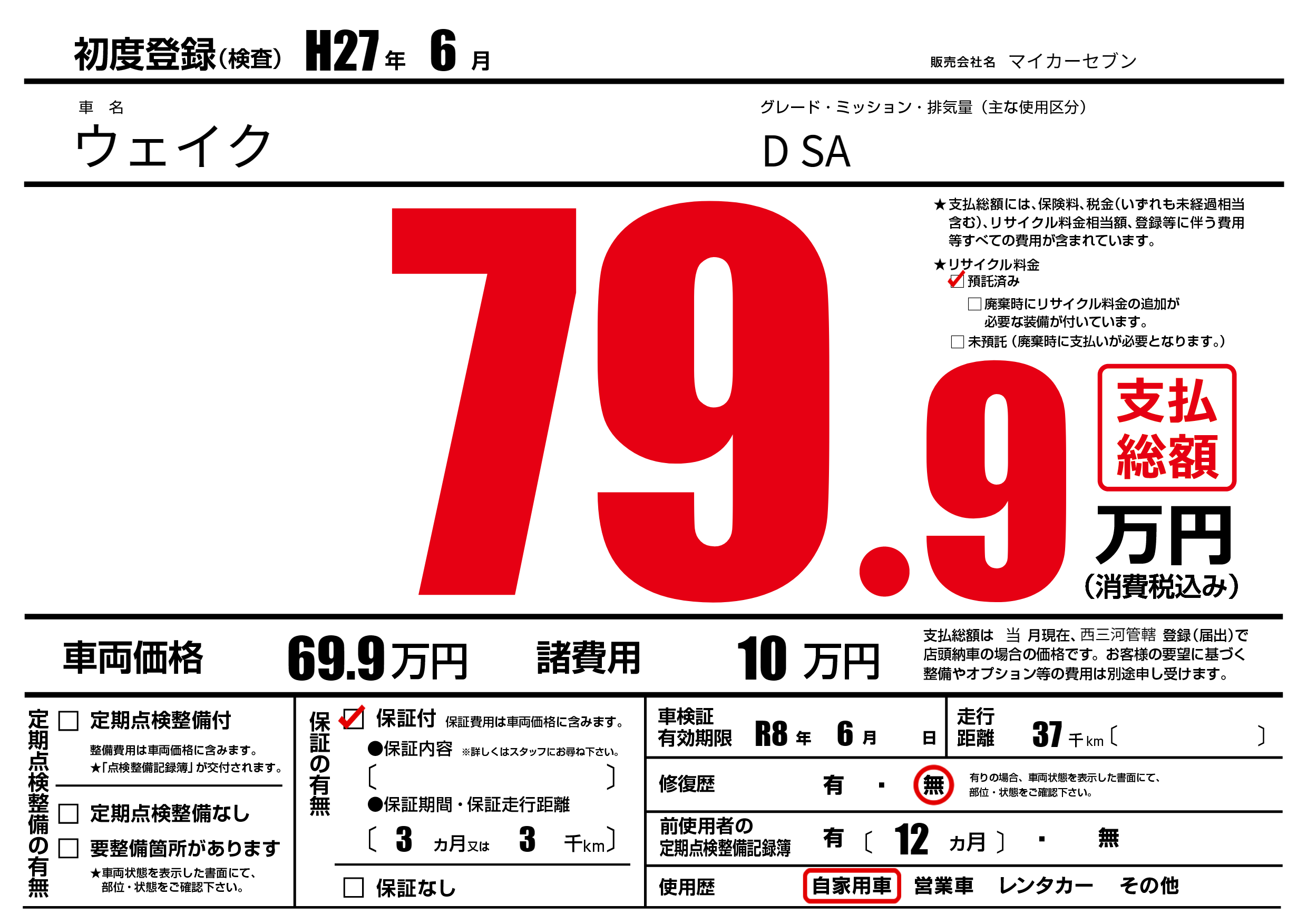 | 走行キロ | 3.7万km | 初年度登録 | H27年6月 |