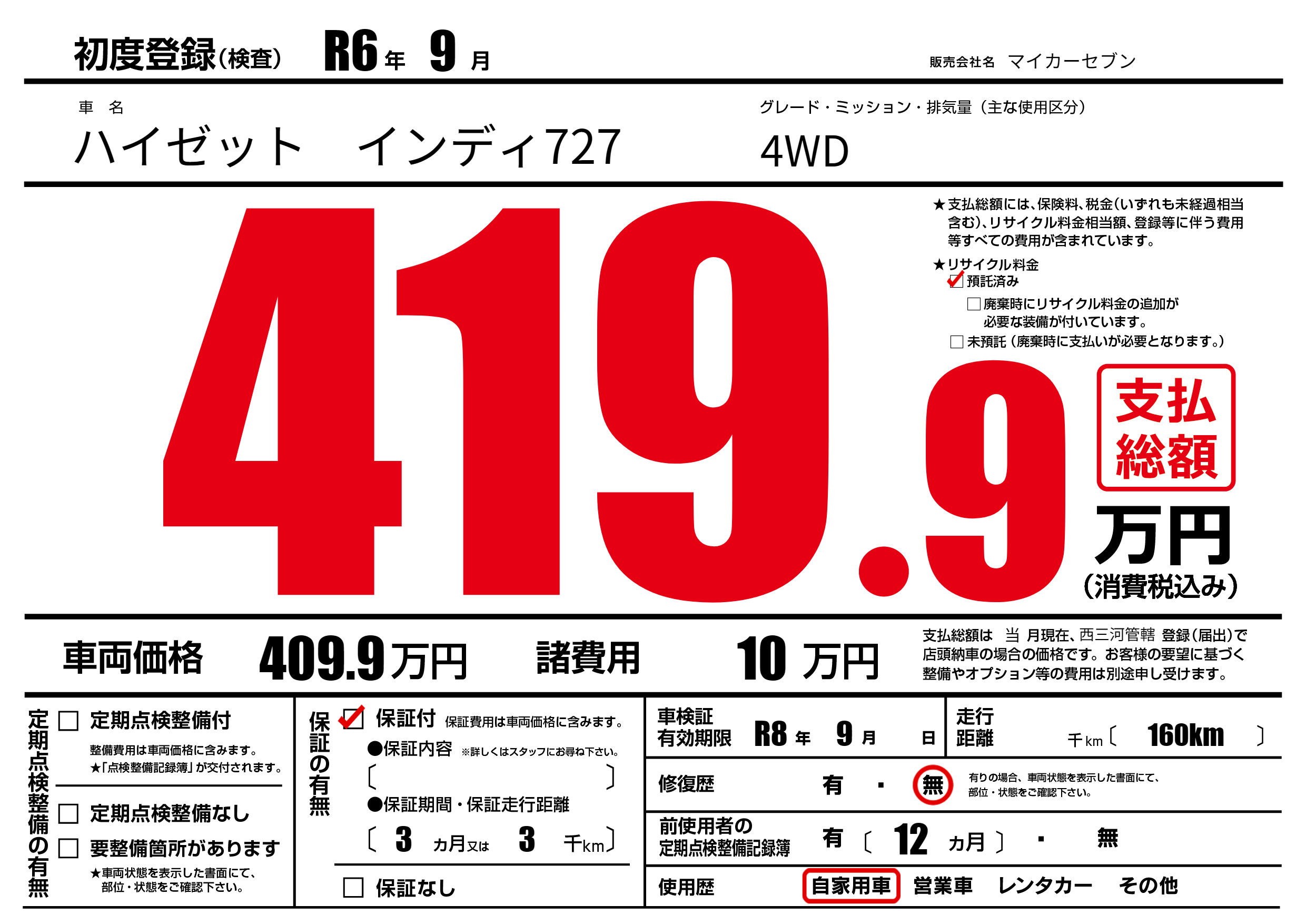 | 車名 | ハイゼット インディ727 | グレード ミッション 排気量 |