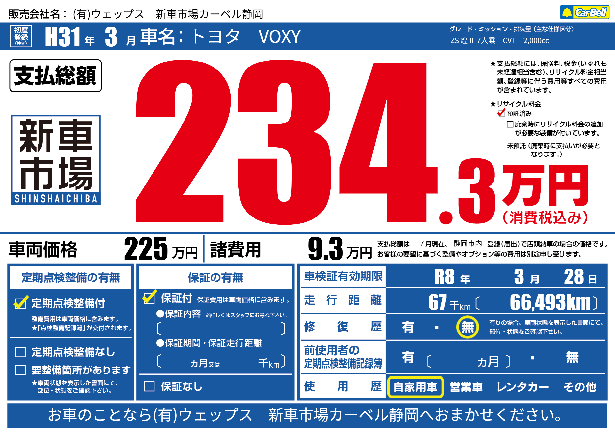 | 車名 | トヨタ VOXY | グレード ミッション 排気量 |
