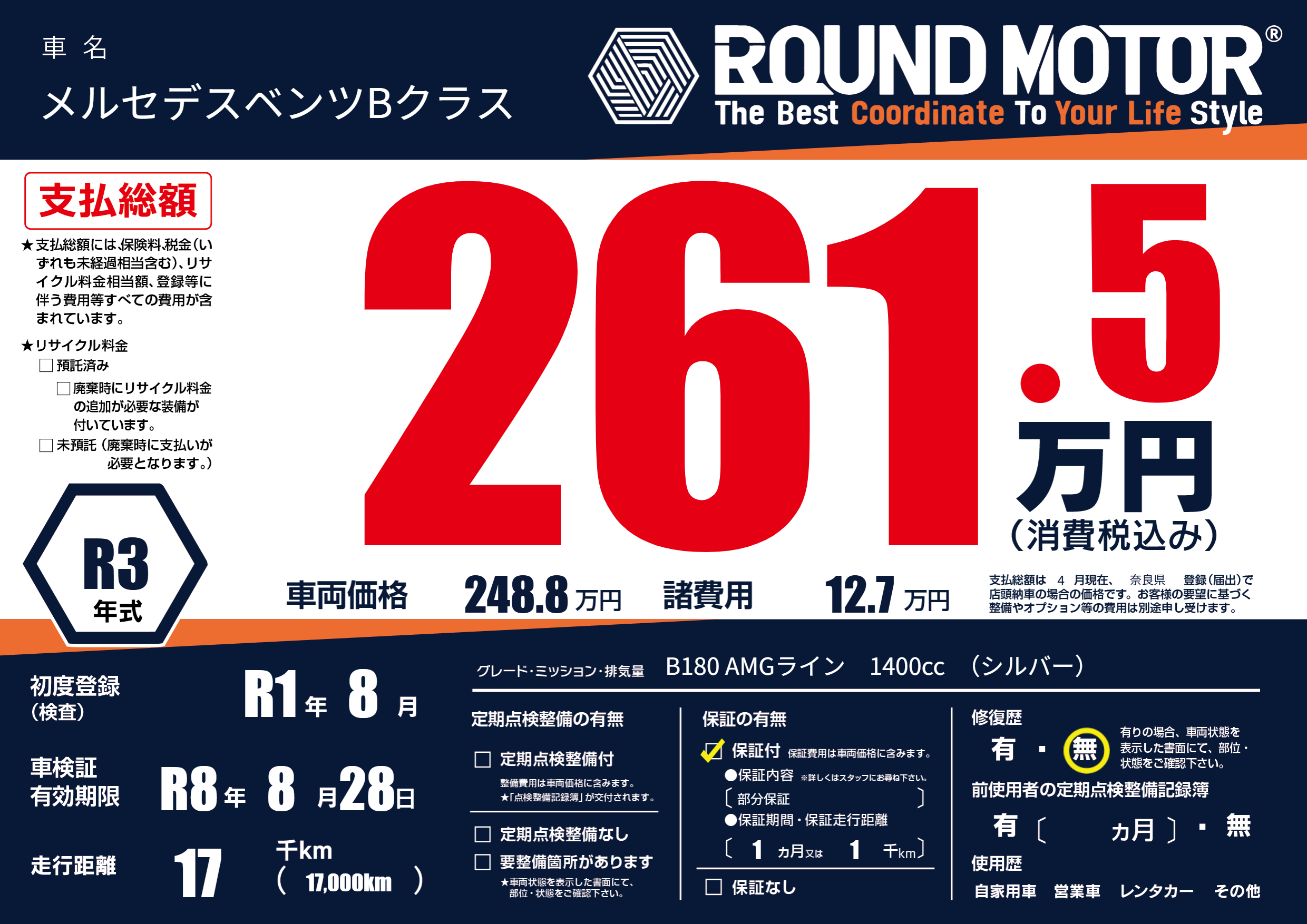 | 車名 | メルセデスベンツBクラス | グレード ミッション 排気量 |