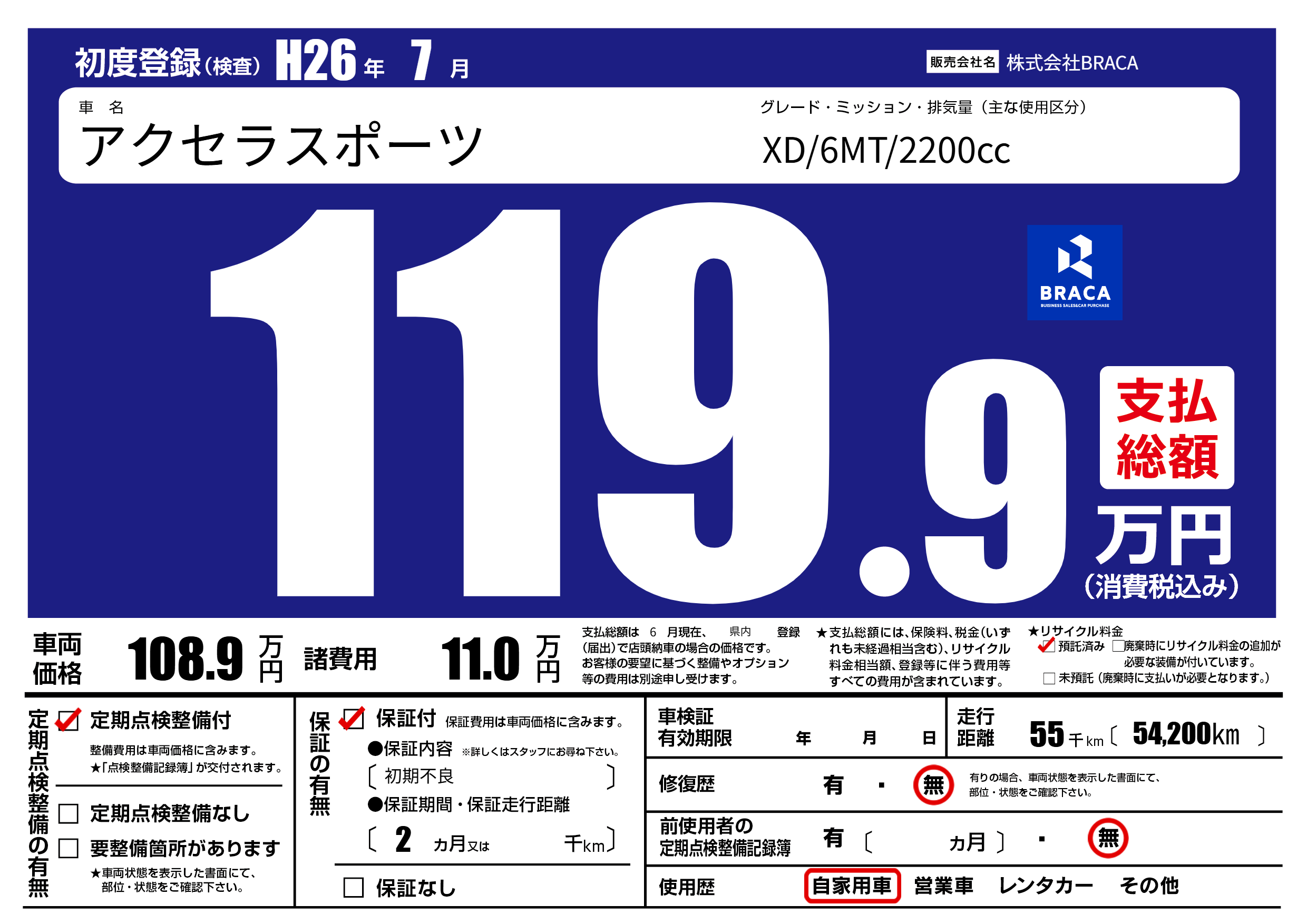 | 走行キロ | 5.5万km | 初年度登録 | H26年7月 |