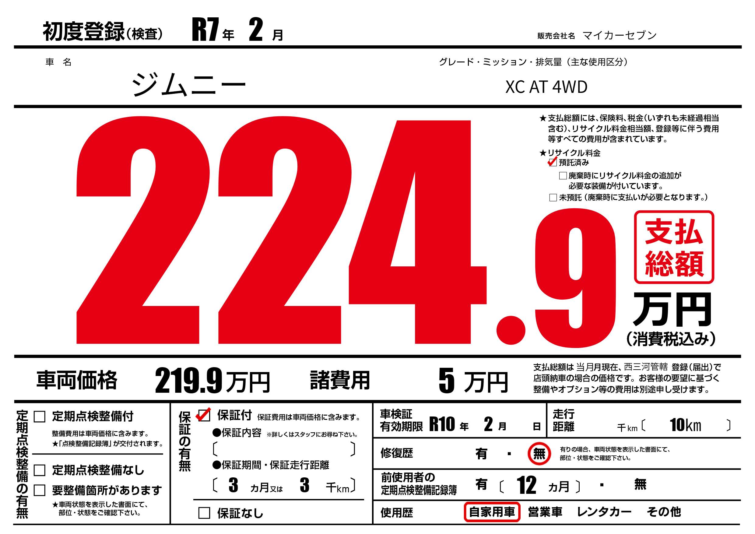 | 走行キロ | - | 初年度登録 | R7年2月 |