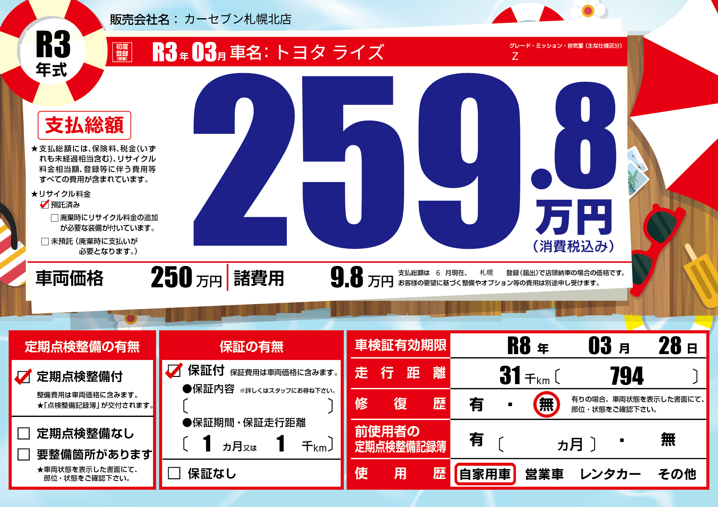 | 走行キロ | 3.1万km | 初年度登録 | R3年03月 |