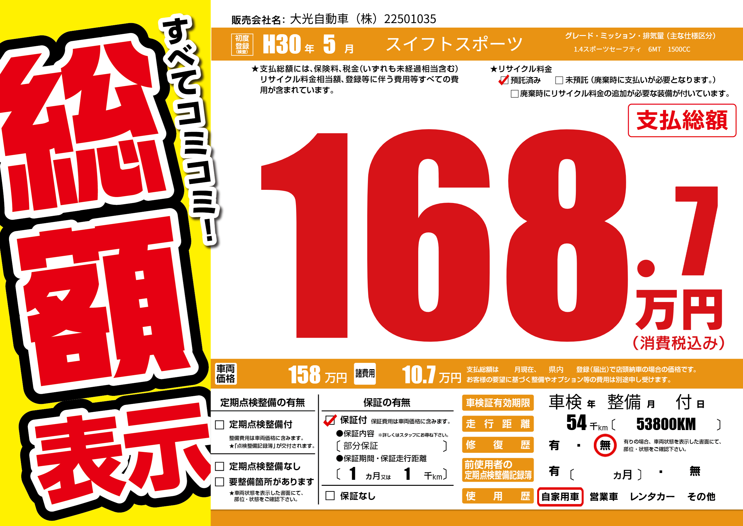| 車名 | スイフトスポーツ | グレード ミッション 排気量 |