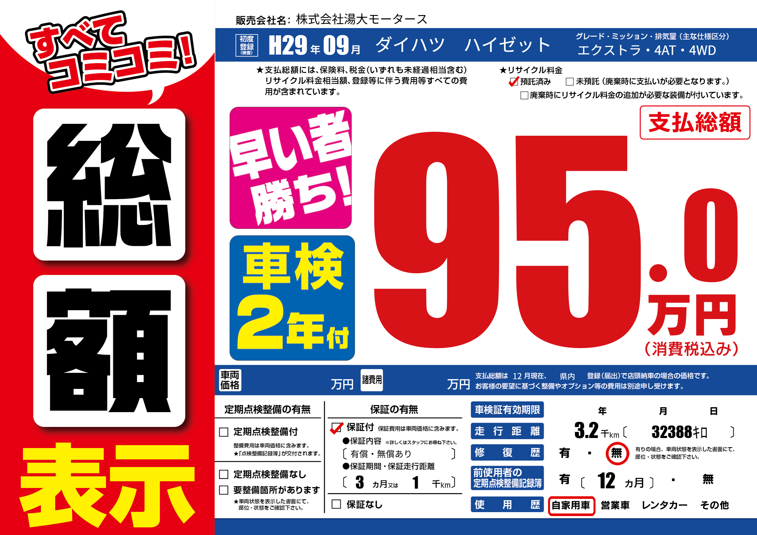 | 車名 | ダイハツ ハイゼット | グレード ミッション 排気量 |