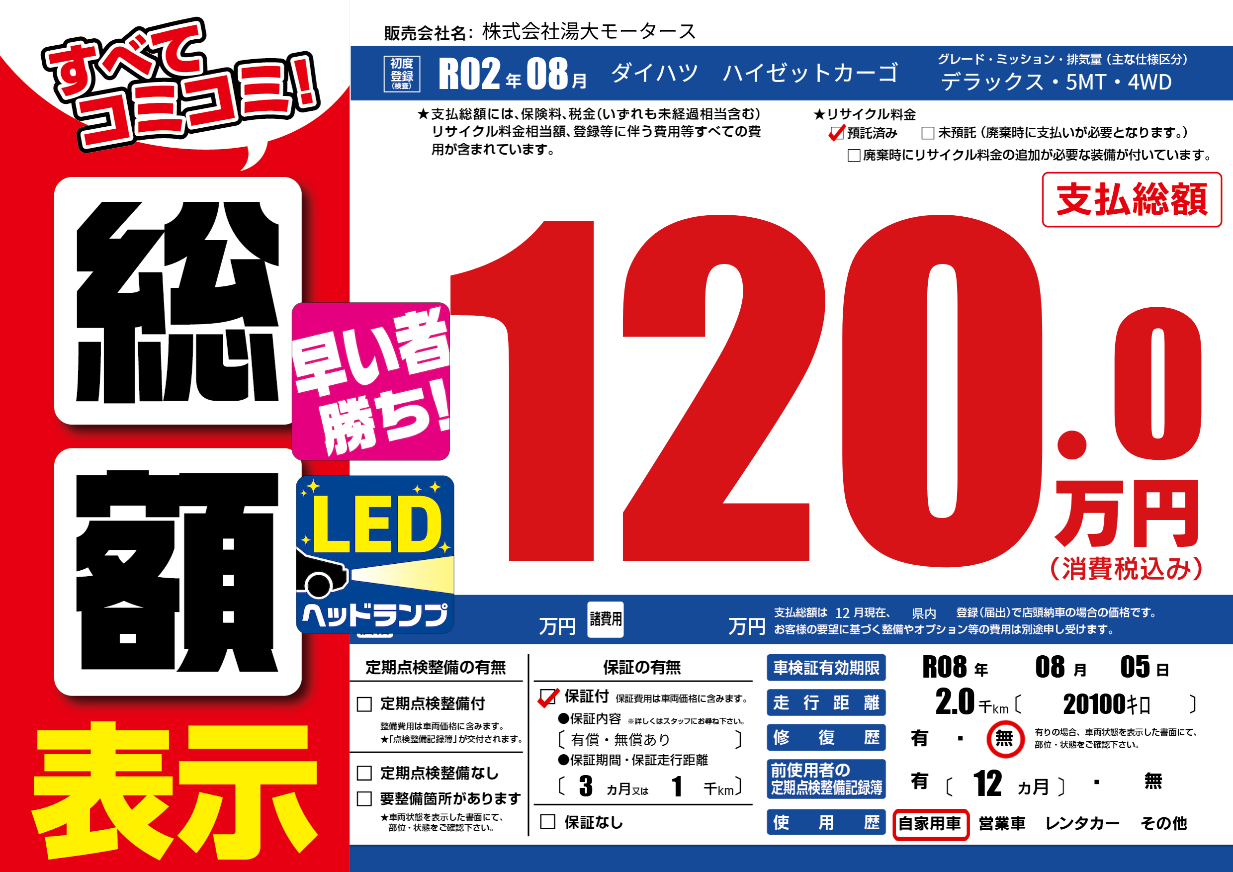 | 車名 | ダイハツ ハイゼットカーゴ | グレード ミッション 排気量 |