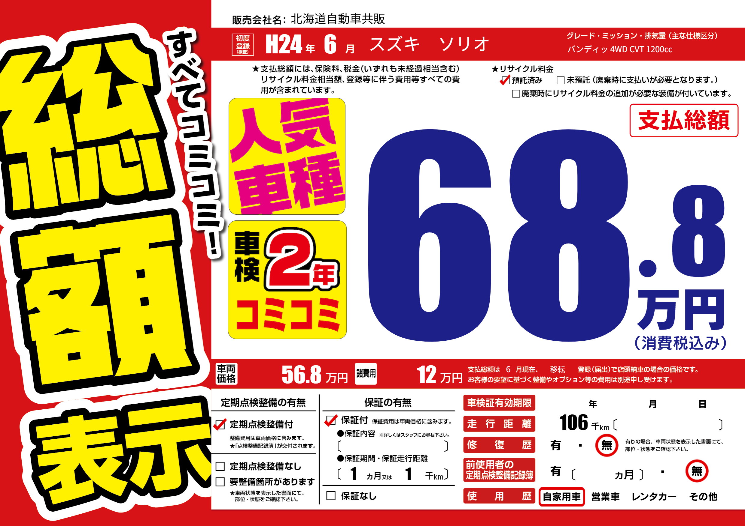 | 走行キロ | 10.6万km | 初年度登録 | H24年6月 |