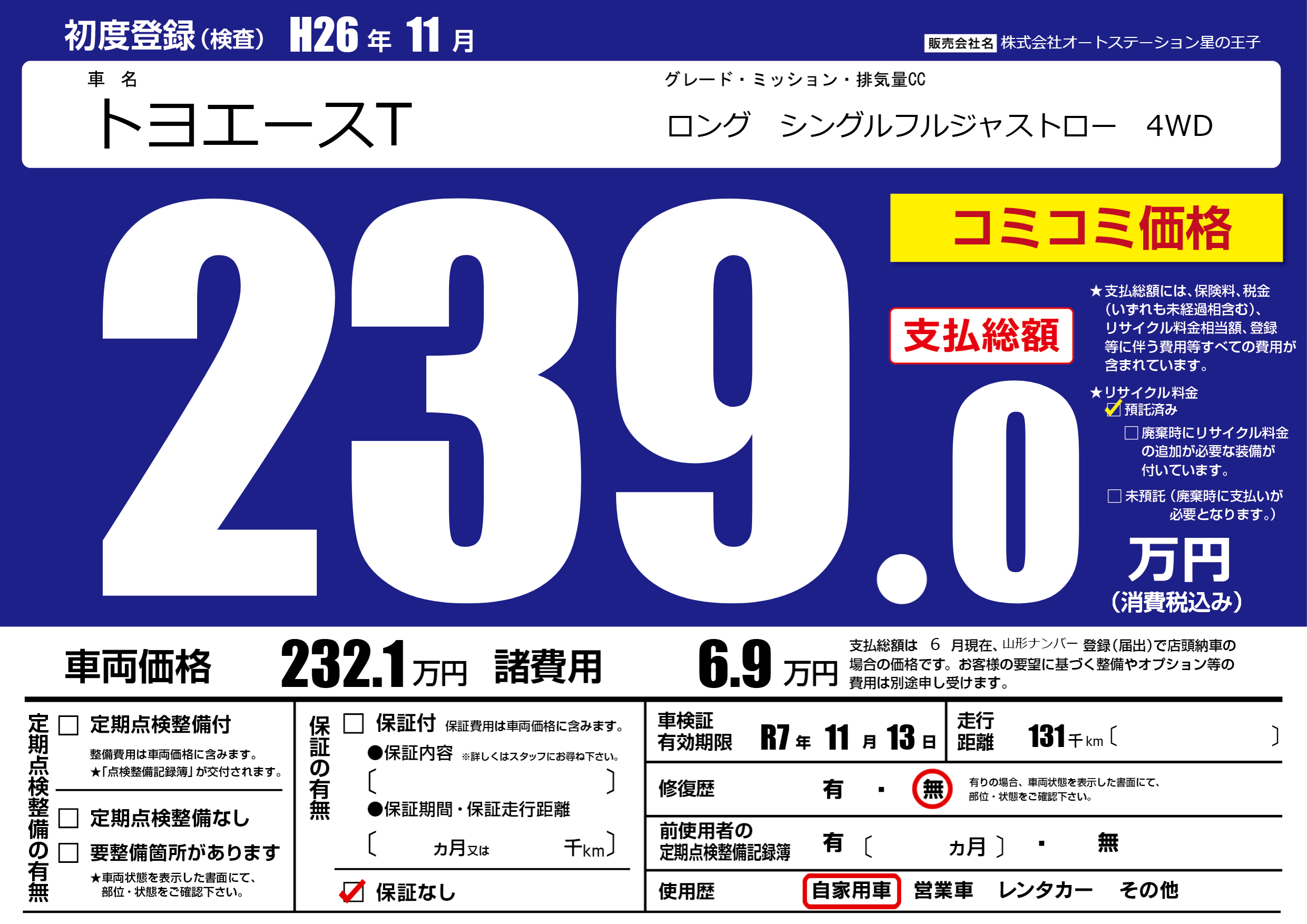 | 走行キロ | 13.1万km | 初年度登録 | H26年11月 |