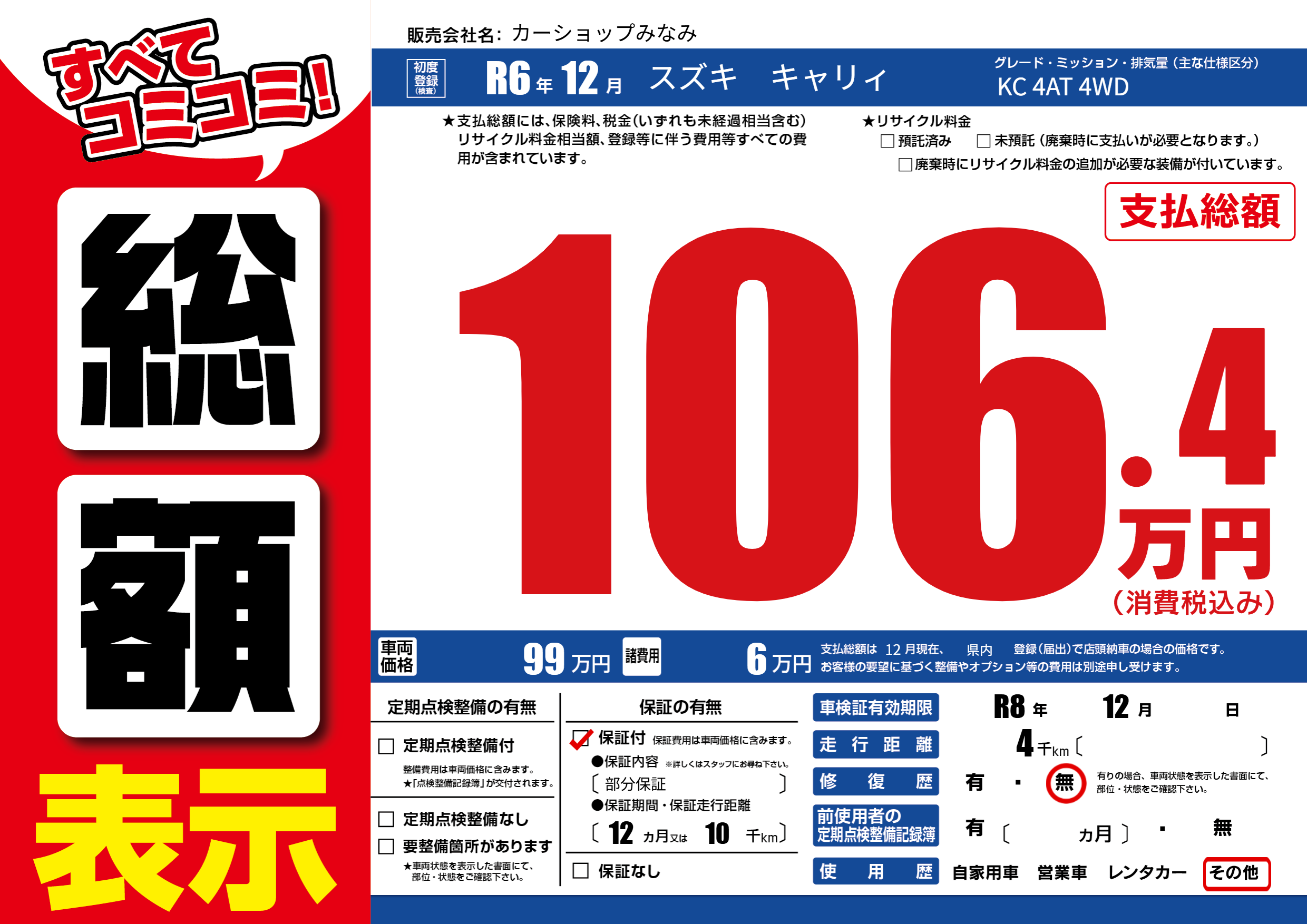 | 車名 | スズキ キャリィ | グレード ミッション 排気量 |
