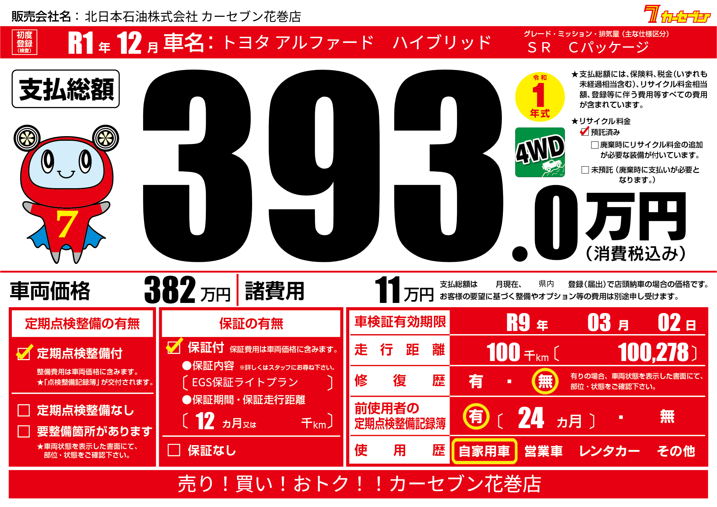 | 走行キロ | 10万km | 初年度登録 | R1年12月 |
