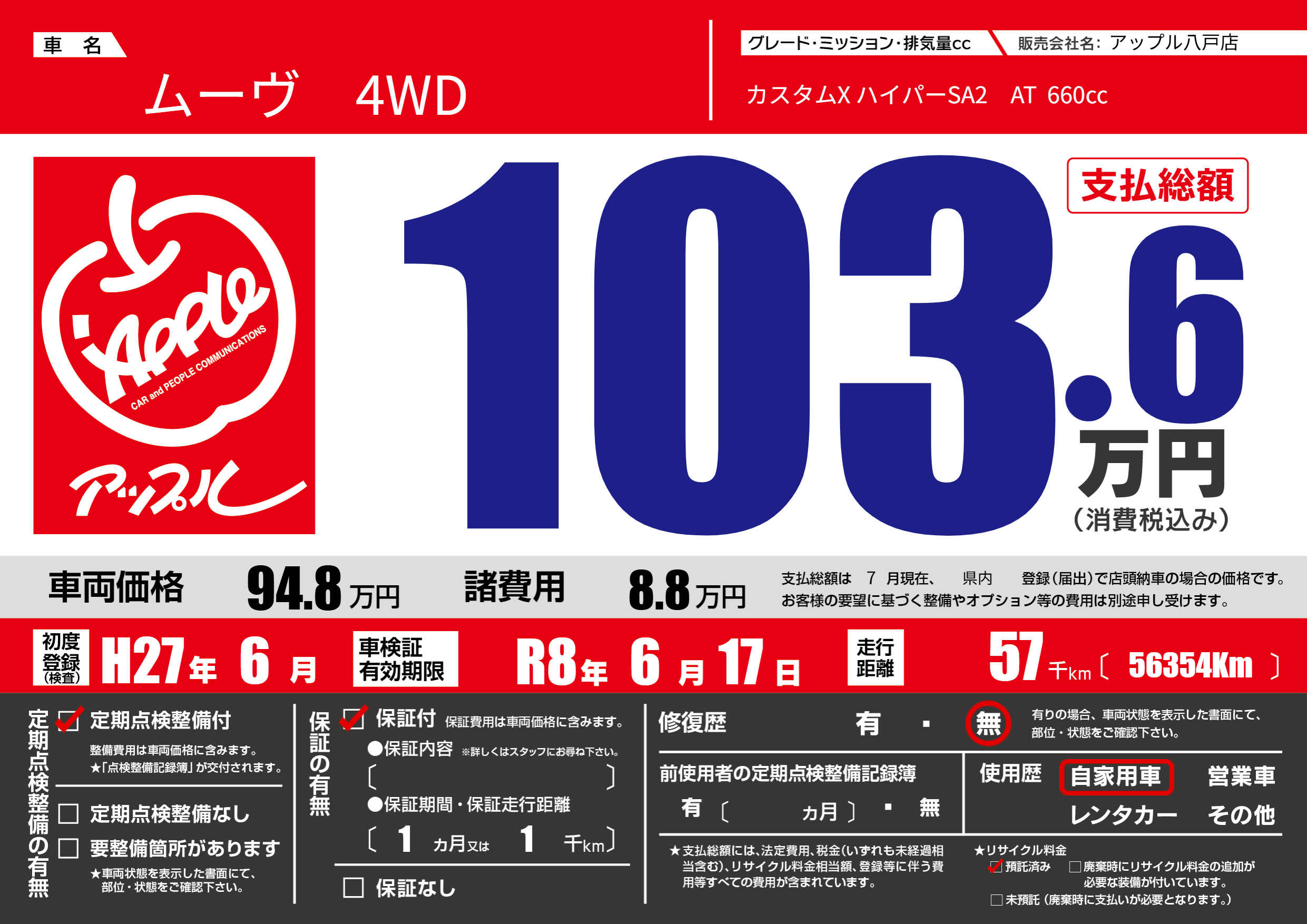 | 車名 | ムーヴ 4WD | グレード ミッション 排気量 |