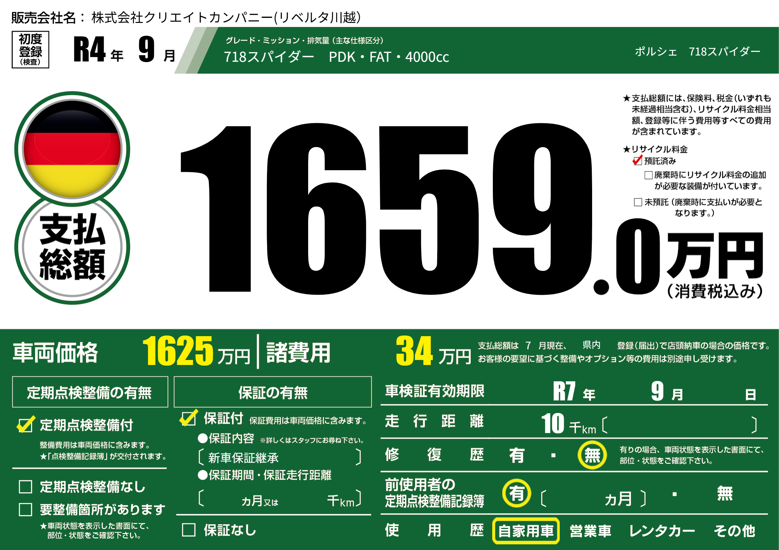 | 車名 | ポルシェ 718スパイダー | グレード ミッション 排気量 |
