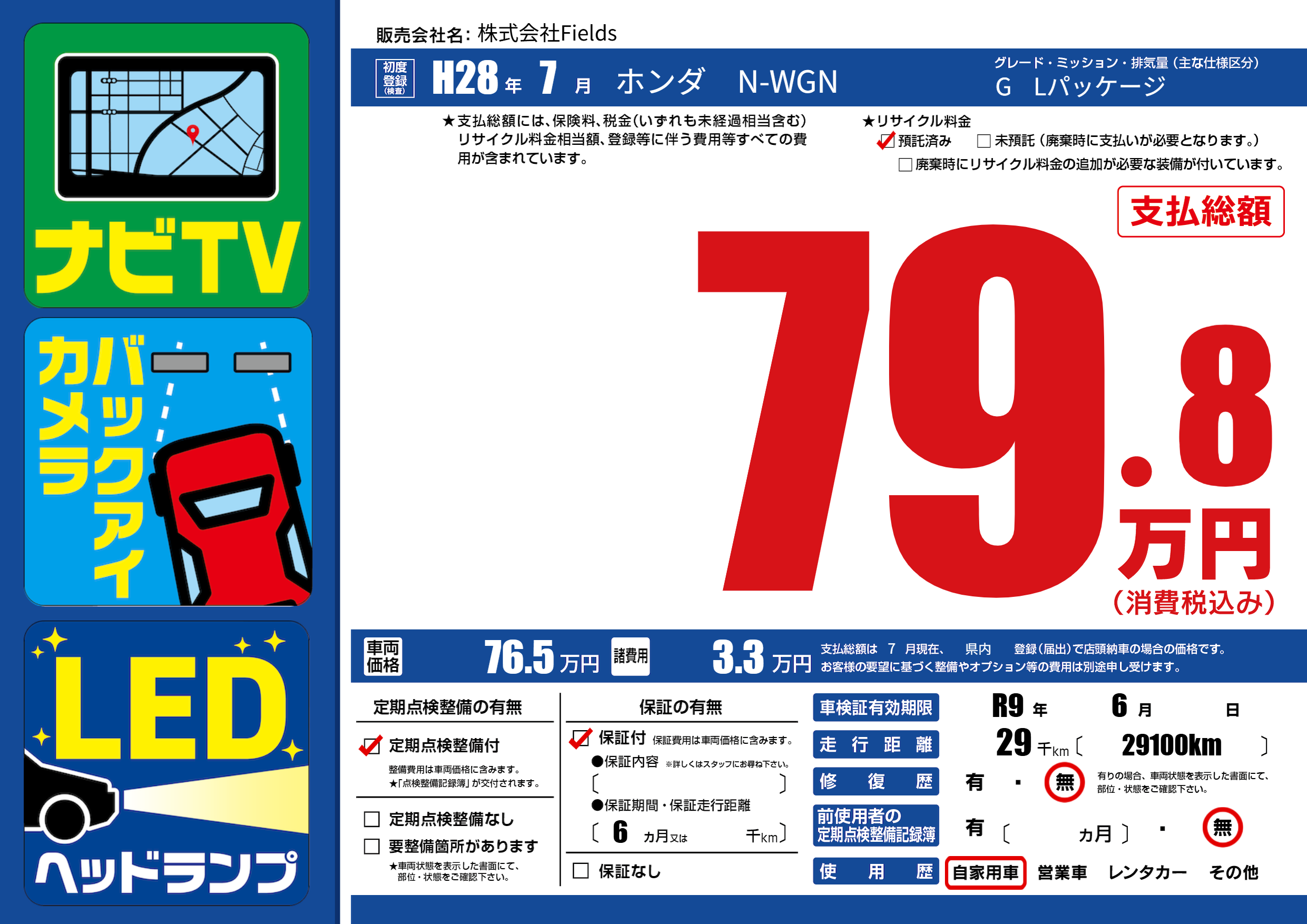 | 車名 | ホンダ N-WGN | グレード ミッション 排気量 |