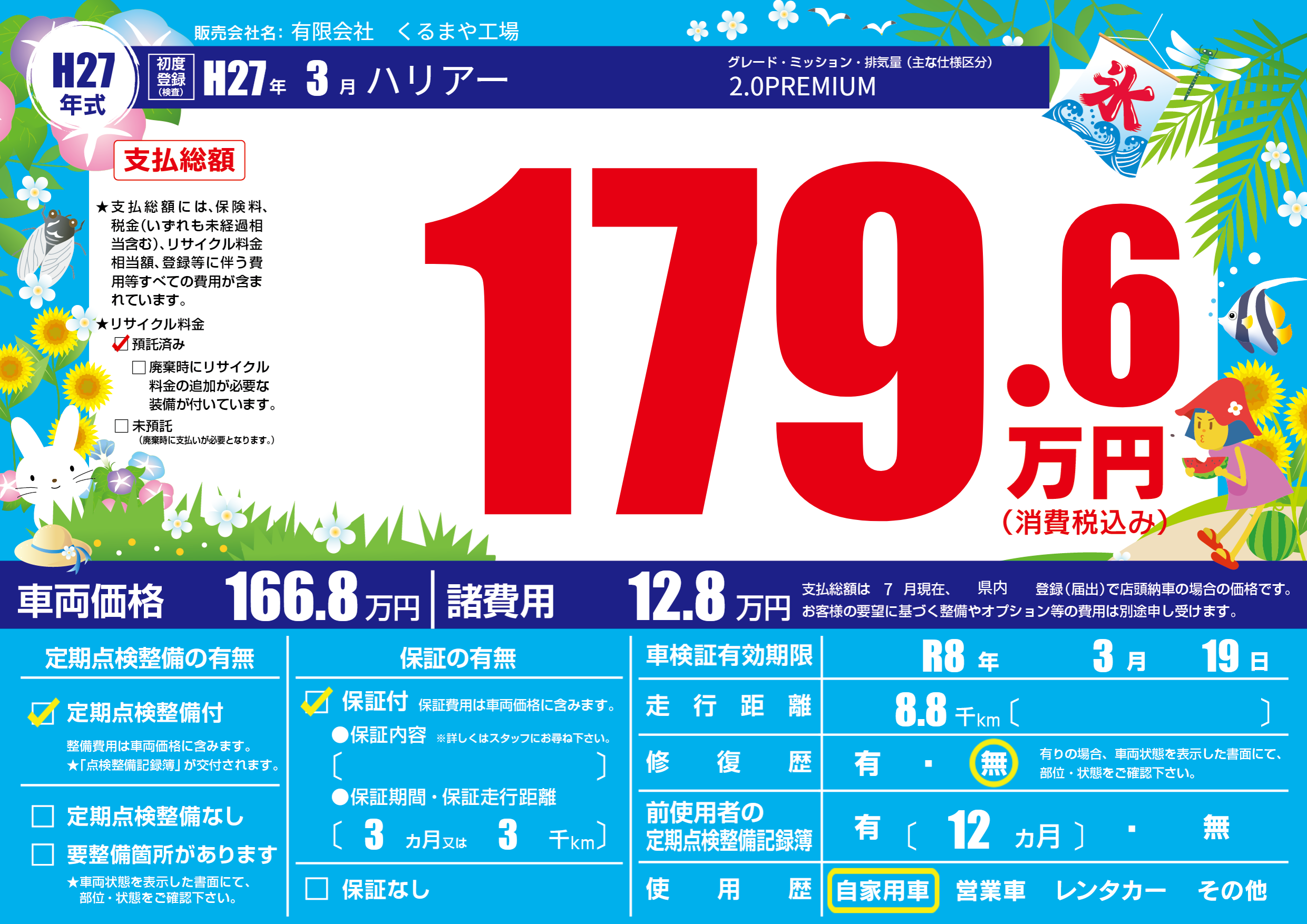 | 走行キロ | 0.8万km | 初年度登録 | H27年3月 |